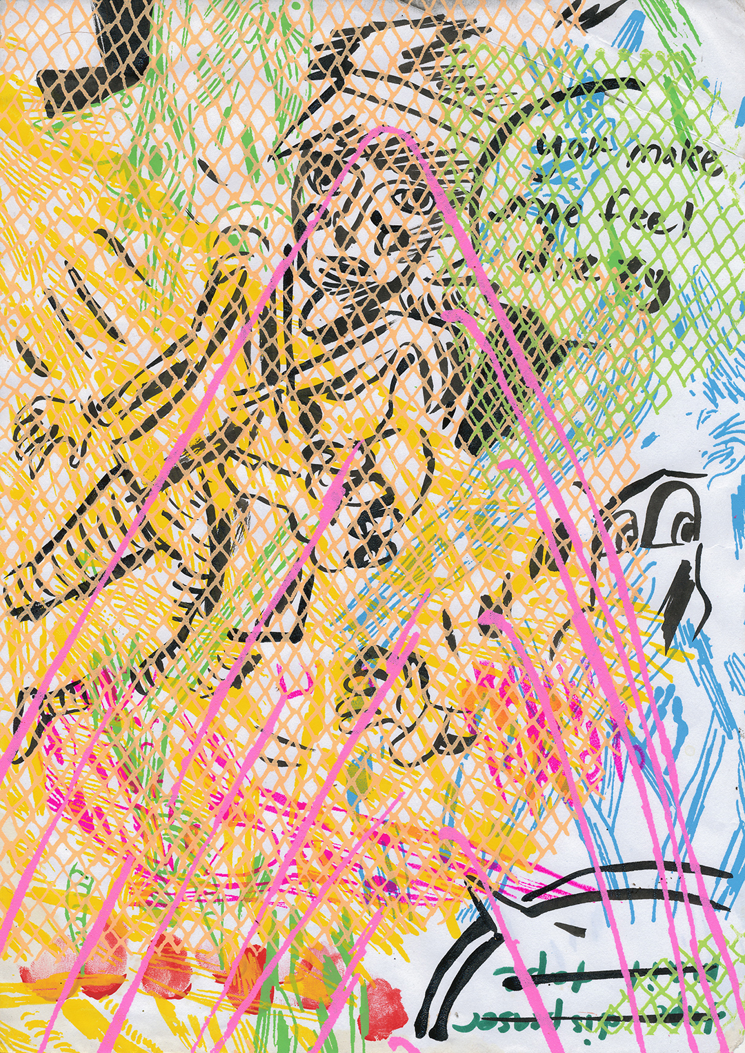 Small unique drawing w/ silkscreen elements. 11.625 H x 8.25 W. Signed. 2014. By Brian Chippendale.