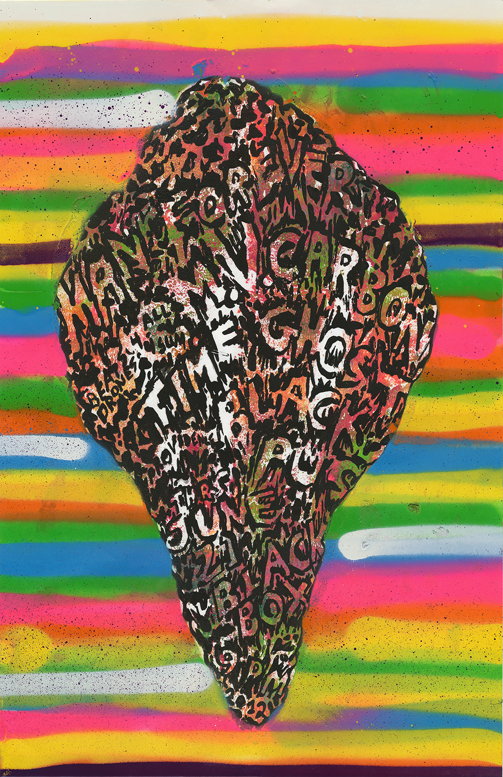 1 color silkscreen with unique spray painted background as shown. 20"H x 13"W. There is no edition number, i think i made about 30-40 of these. I keep finding copies that were just the silkscreened info part and I'm finishing off the spray part. This is a show poster, bands include Man Forever, M.V. Carbon, Time Ghost and Black Pus, it took place at The Black Box in Providence. Printed in June 2012 + sprayed in 2014. Designed and handprinted by Brian Chippendale.