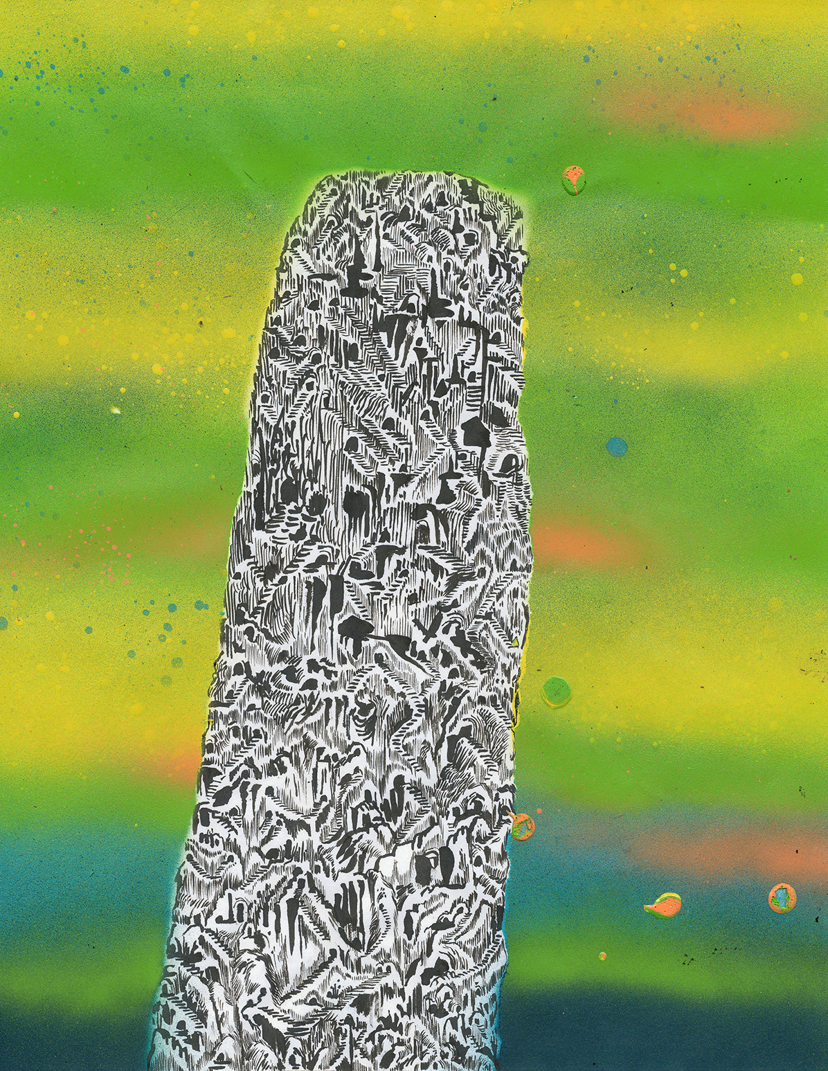 small ink drawing with spray paint on paper. 11"H x 8.5"W. Unique, not a print. Made in 2015. Designed and handmade by Brian Chippendale.