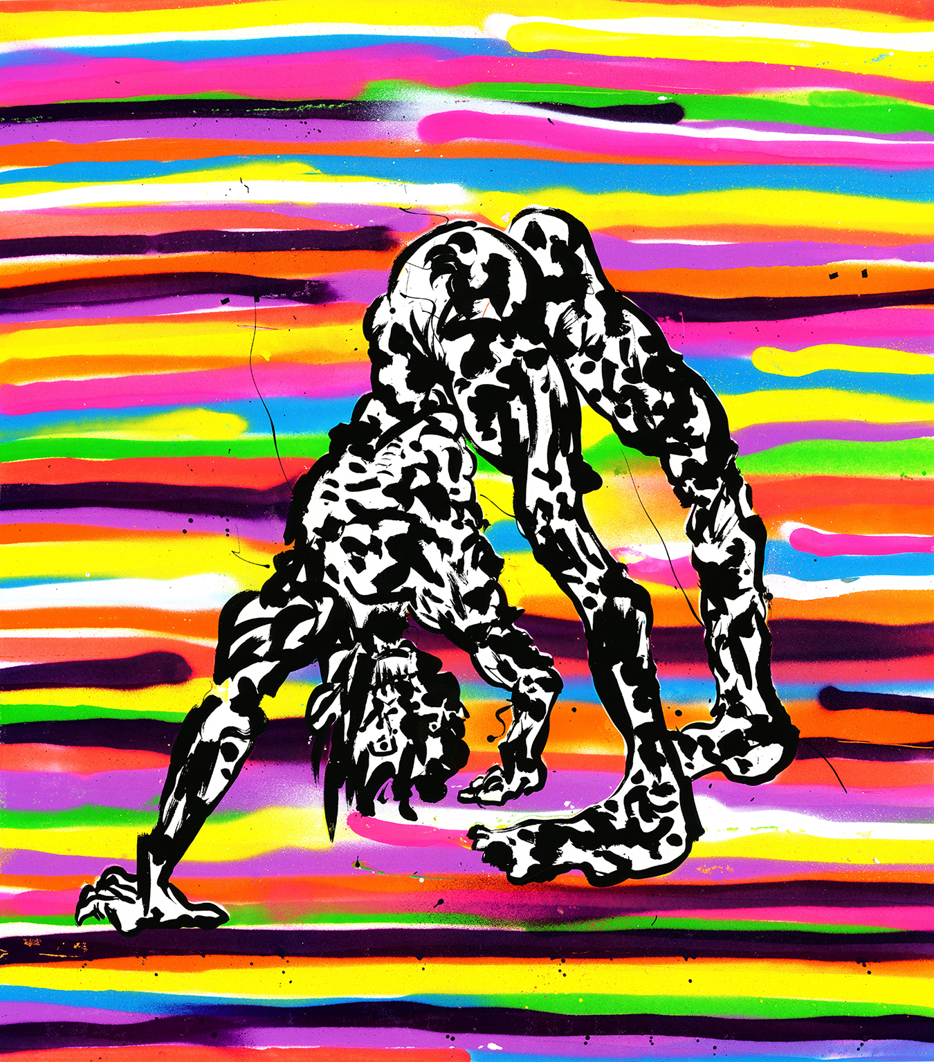 Very realistic silkscreened yoga pose with unique spray paint background as pictured in photo. 26"H x 23"W. This is #4 in an edition of 8, the spray aspect of each is different. Made in January 2015. Designed and handmade by Brian Chippendale.