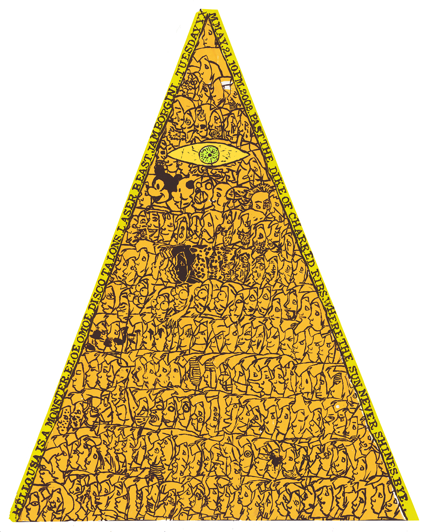 1 copy of this 4 color silkscreen. 23.25"H x 18.75"W. (THIS THING IS CUT INTO A TRIANGLE SHAPE). the original edition is unknown, probably around 40? There is a version with a pink eye as well, maybe the same amount printed. Both printed in the same week. This is a show poster; bands include USA IS A Monster, Eloe Omoe, Disco Talons, Laserbeast(Lightning Bolt codename) and Jamborgini. (it was a great show). Venue was my house from 2002-2004, on this print the name is "Past the Dike Of Charred Ribs, Where the Sun Never Shines". The venue name shifted from show to show. Providence RI. Printed in 2002. Designed and handprinted by Brian Chippendale.