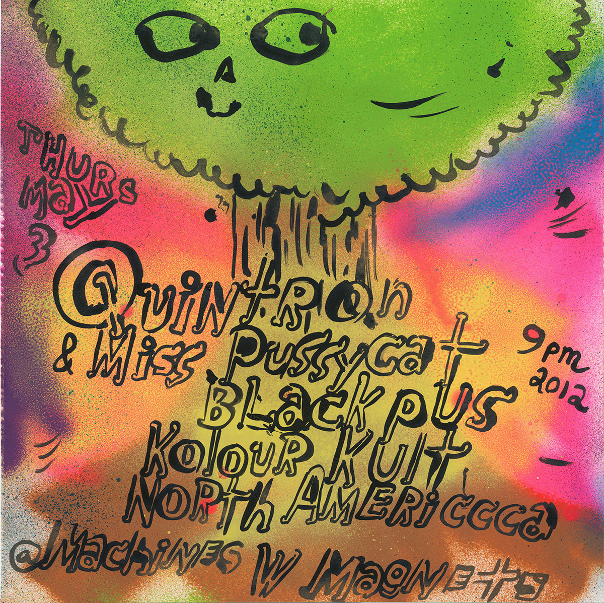 13" x 13" spray paint and black acrylic "show painting". I was in a phase where it was easier to hand draw a flyer than print one. I probably made about 15 of these, each subtly different. Bands include The Mighty Quintron and Miss Pussycat, Black Pus, Kolour Kult and North America. Show was at Machines with Magnets here in lovely Rhode Island. Designed and painted by Brian Chippendale in 2012.