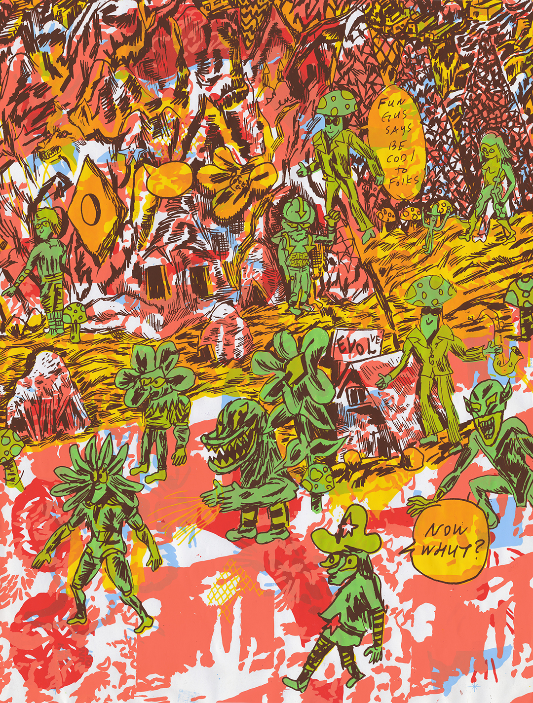 6 color silkscreen. 25"H x 18.5"W. This is a one of a kind print, a mashup of various screens. Printed in December 2016 in the Hilarious Attic. Designed and handprinted by Brian Chippendale.