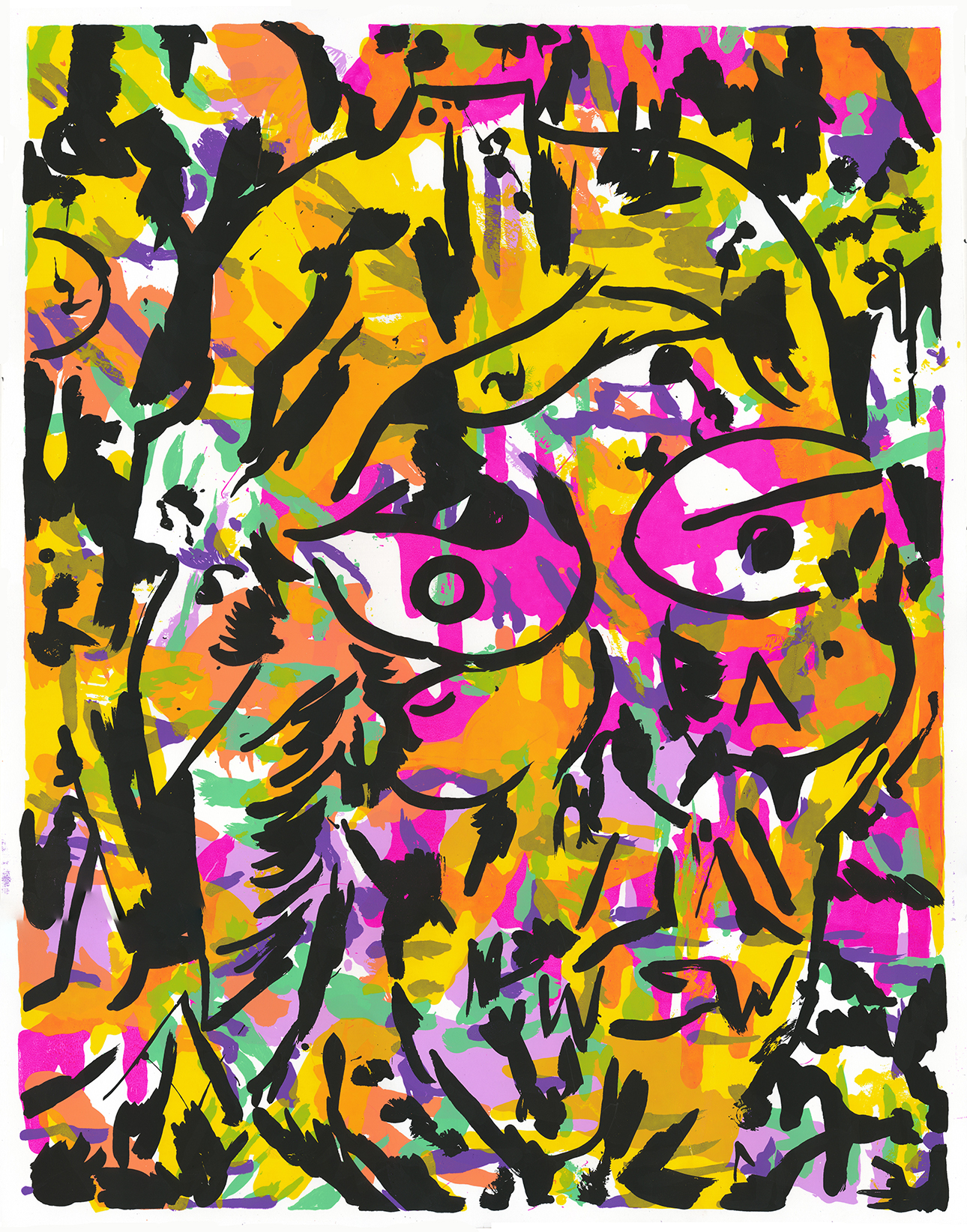8 color silkscreen. 29.25"H x 23"W. Signed and numbered edition of 40. Printed in January 2017 in the Hilarious Attic. Designed and handprinted by Brian Chippendale.