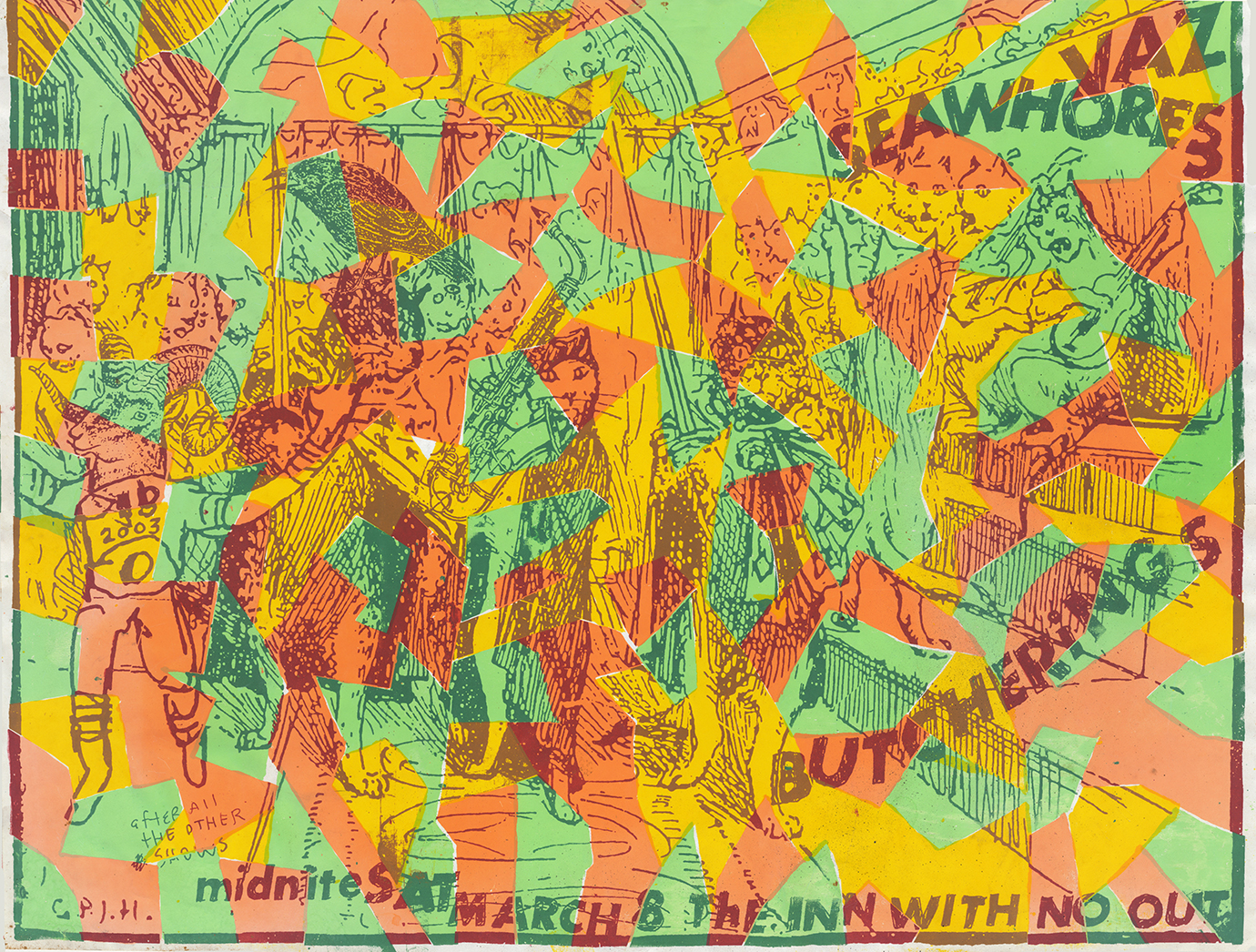 1 copy of this 2003 4 color silkscreen. Corners are slightly dinged up and paper is a little weathered but it looks good. Photo is a scan of the copy for sale.19"H x 25"W. the original edition is unknown, probably around 50? This is a show poster; bands include Vaz, Seawhores and Butcherings. Venue was my house from 2002-2004, on this print the name is "The Inn with No Out". The venue name shifted from show to show. Providence RI. Printed in 2003. Designed and handprinted by Brian Chippendale.