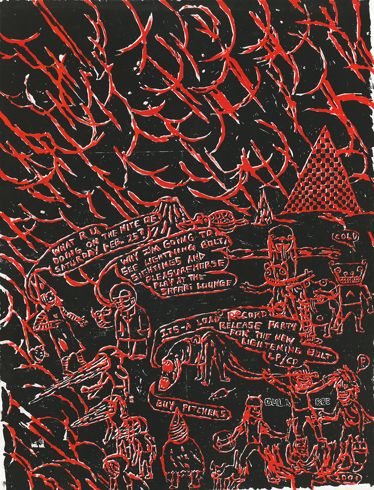 2 color print. 23"H x 17.5" W. Edition unknown. Probably around 50. This thing is 17 years old! damn. Silkscreen print for the Lightning Bolt "Ride The Skies" LP release party at the legendary Safari Lounge in Providence RI. Bands include Lightning Bolt, Sightings and Pleasurehorse (Shawn Greenlee). Designed and printed in the also legendary Fort Thunder in the legendary year of 2000 by the secondary Brian Chippendale