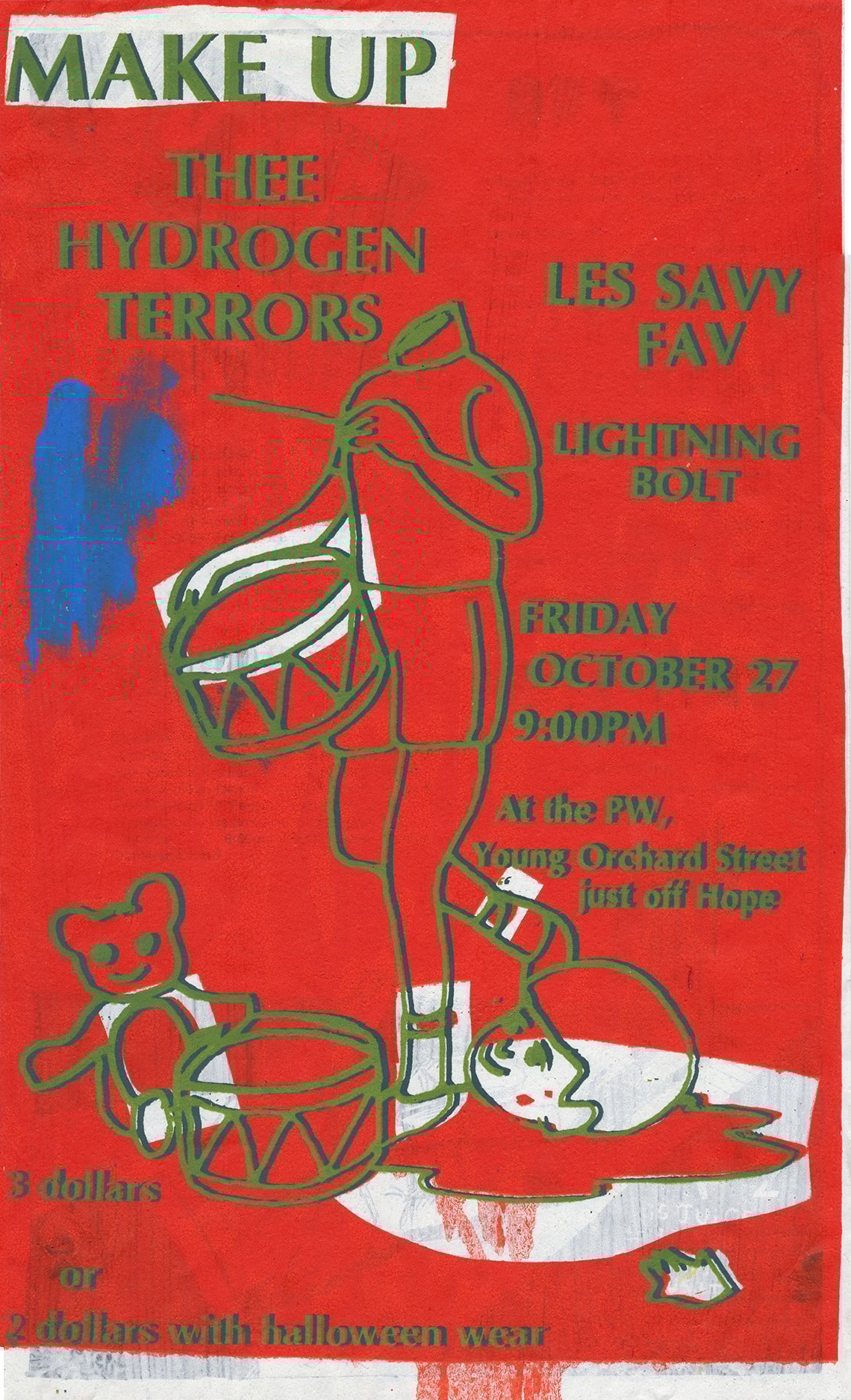 small 3 color silkscreen on 8.5" x 14" gesso coated legal paper. It's actually printed on the back of some sort of photocopied RISD calendar thing. I doubt there are many of these, maybe i printed 30. I'm guessing this is 1996, like, Hisham Bharoocha was still in the band for this show. We were all painted green. Our school mates Les Savy Fav played. Tim still had plenty of hair. This is ancient history, one the earliest LB flyers. Designed and printed by Brian Chippendale at The Rhode Island School of Design.
