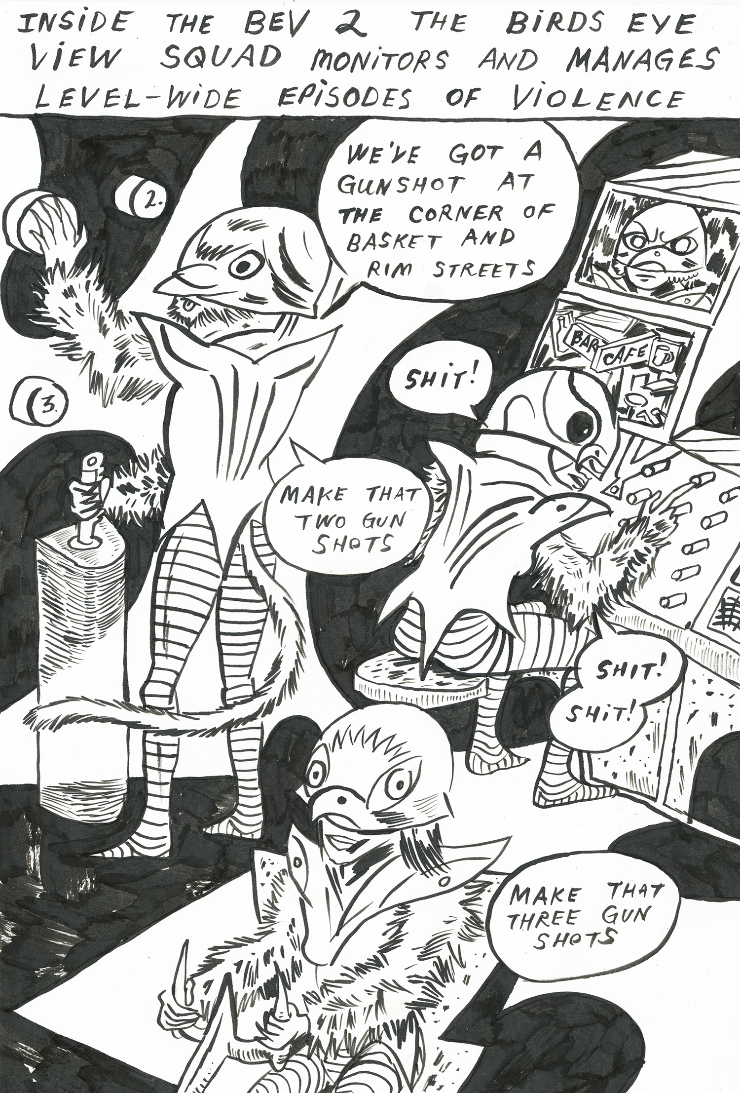 Page 8 of the hit instagram comic "Bottomless Pit 123". 15" H x 10" Wide. First appearance of the legendary Birds Eye View Squad. Ink drawing on paper, 2017 by Brian Chippendale. Ships Flat.