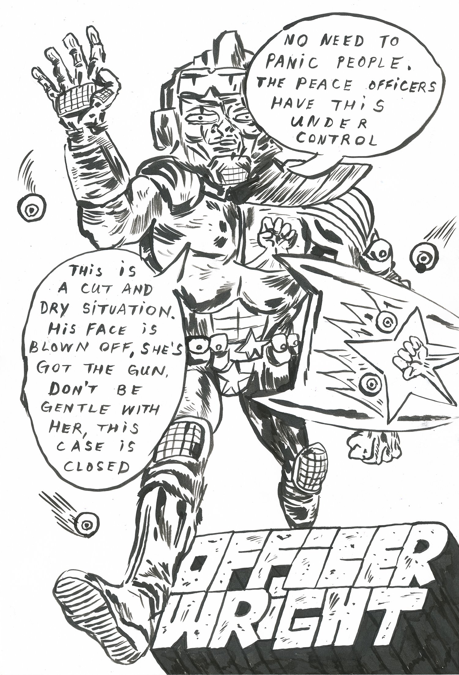 Page 11 of the VIRAL HIT instagram comic "Bottomless Pit 123". named "Instagram's longest running mystery story" by me right here right now. 15" H x 10" Wide. First appearance of the weird-legged Officer Wright. Ink drawing on paper with a little bit of white-out here and there. Brian Chippendale 2017. Ships Flat.