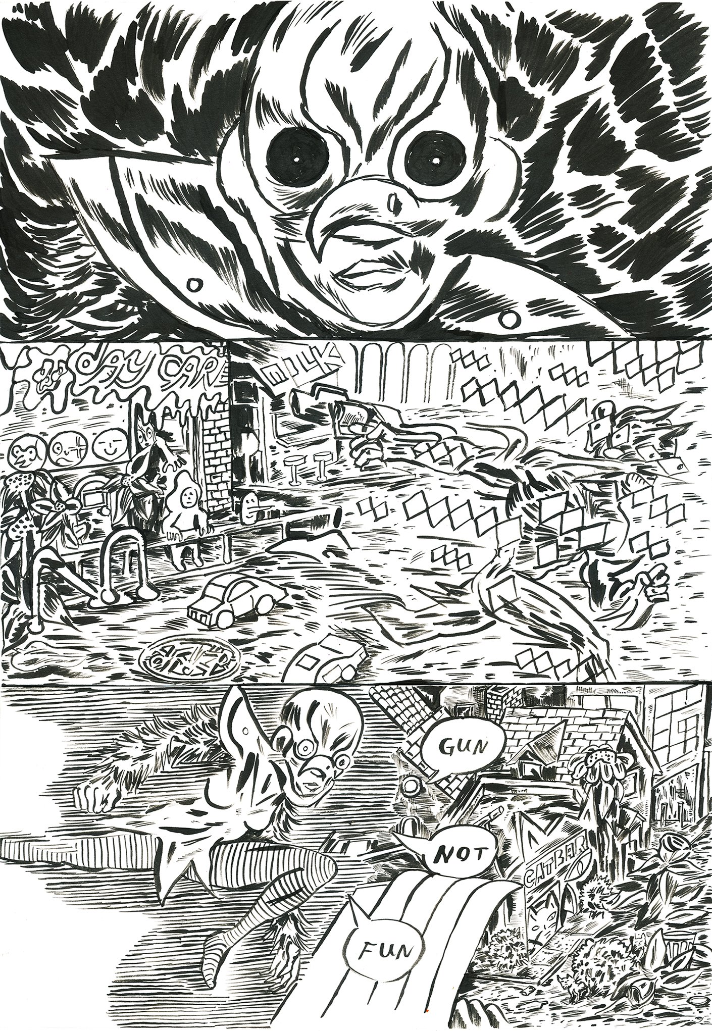 originally drawing for Page 16 of the ACTION ORIENTED instagram comic "Bottomless Pit 123". This is the first page with panels. Collectors item. This page is on the bigger side and is dense so it's pricier. 18"H x 12.5" W. Ink drawing on paper, panel three was redrawn on separate paper and permanently affixed. Bear witness to the process of editing. Best page yet. drawn in 2017 by Brian Chippendale. Ships Flat.