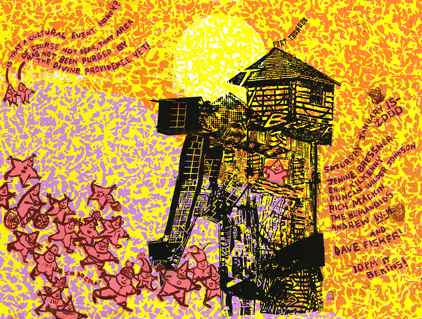 7 color screenprint. 19"H x 25"W. Unknown edition, maybe around 50. What better than the combination of Andrew WK and Fort Thunder? This is pre famous Andrew WK, there were like 20 people there and he played a CD and sang. When he finished his set we pressed play on his CD player again and he did it all over. At some point the audience held a rug and bounced then little skinny Andrew up in the air a bunch of times. Other fabulous acts included: Jenine Bressner, Erin Kilkenny, Duncan Wilder Johnson, Rich Mackin, The Humanoids and the one and only Dave Fischer. I'm assuming a bunch of these people showed films. All in 2000 right around the time when the earth ended. Designed and printed by Brian Chippendale at FT.
