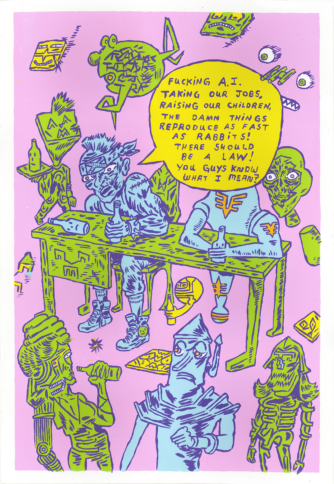 4 color silkscreen. 28" H x 19.25" W. Edition of 50. This is a color version of page 13 of the SMASH HIT instagram comic "Bottomless Pit 123". designed and printed in 2017 by Brian Chippendale