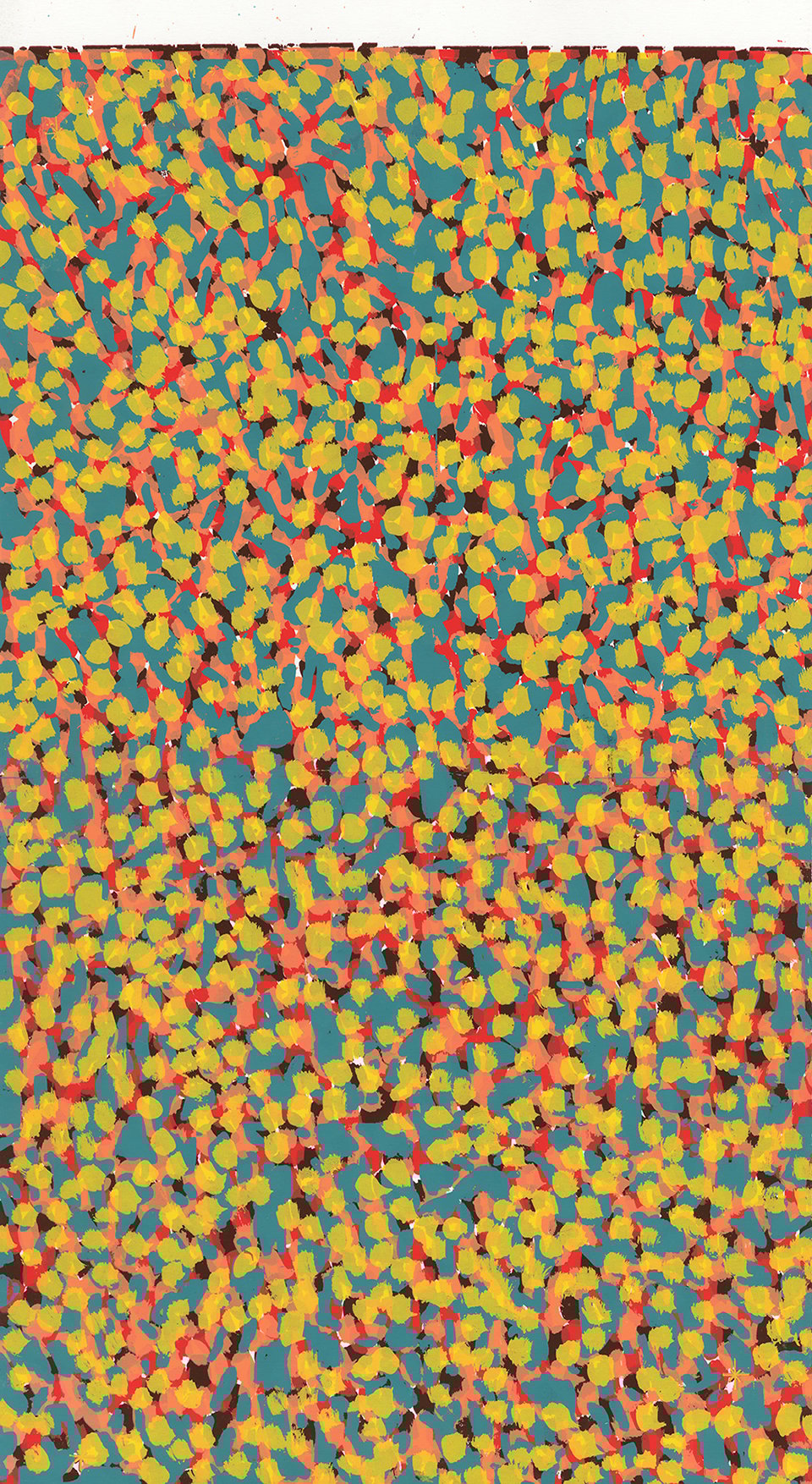 5 color print. Edition of 18. 22.5"H x 12.5"W. Printed in .....hmmm. a while ago. Early 2000s? I print these patterns as "wallpaper" but this is a set on a thicker very un-wallpaperlike paper stock. I might print a version on thinner paper at some point but the colors will never be the same. There's a half inch strip of white at top, could be lopped off for framing if desired. Designed and printed by Brian Chippendale.