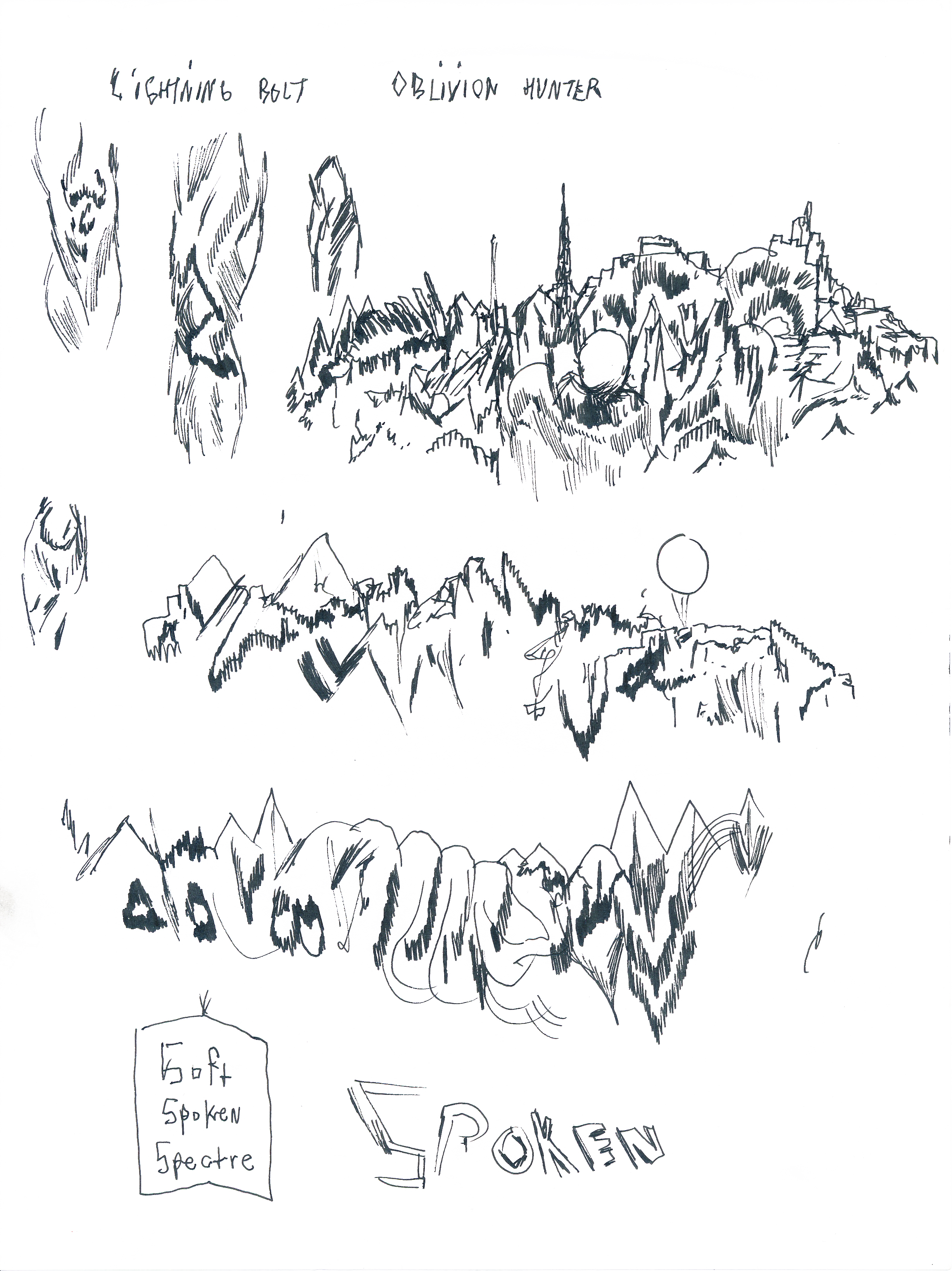 India ink drawing. 8.25H x 11"W. Drawing most likely done around 2012 when Lightning Bolt's Oblivion Hunter tour LP was released. Looks like unused art-brainstorming for the cover. Drawn by Brian Chippendale