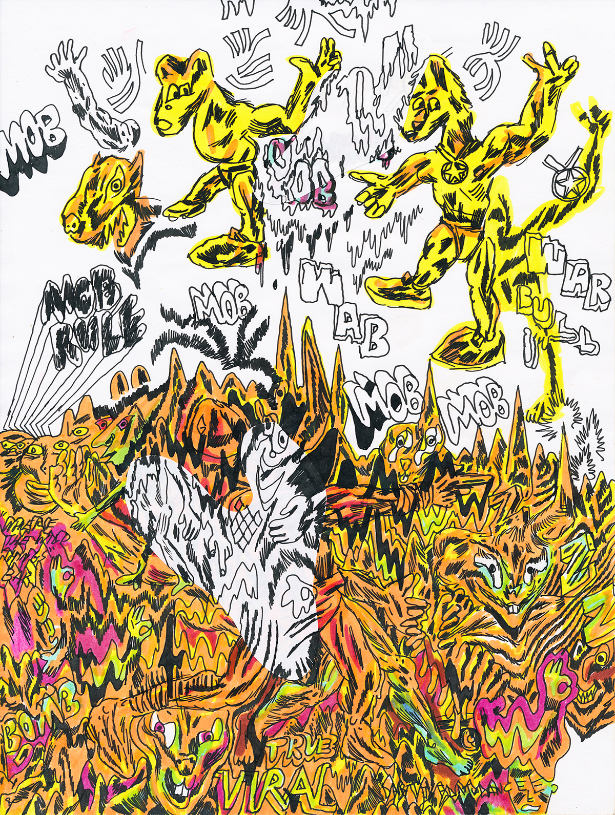 drawing w/ collage on paper with india ink and marker. 11"H x 8.25" W. Drawn by Brian Chippendale, Fall 2018