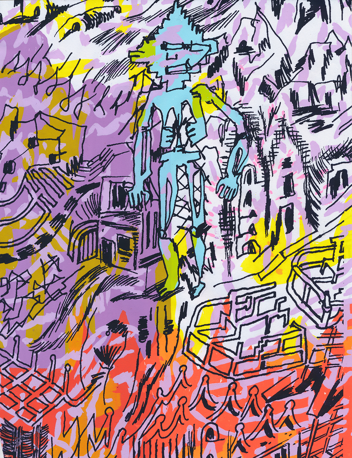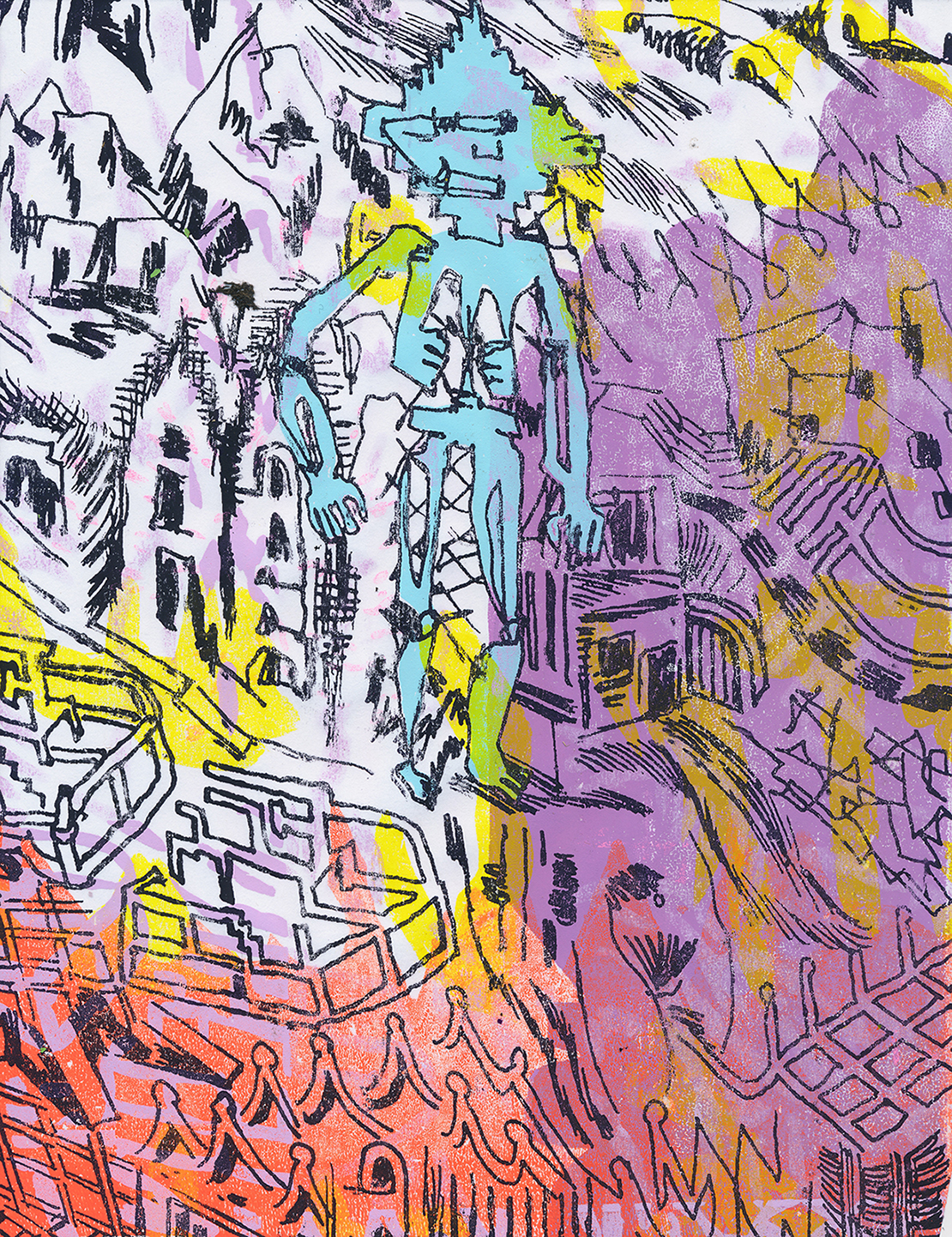 multicolored ! 5-8? mash-up mini-silkscreen unique print. 8.5"W x 11"H. Reversible! see photos. perfect for throwing darts at. Undesigned and printed by Brian Chippendale, 2018