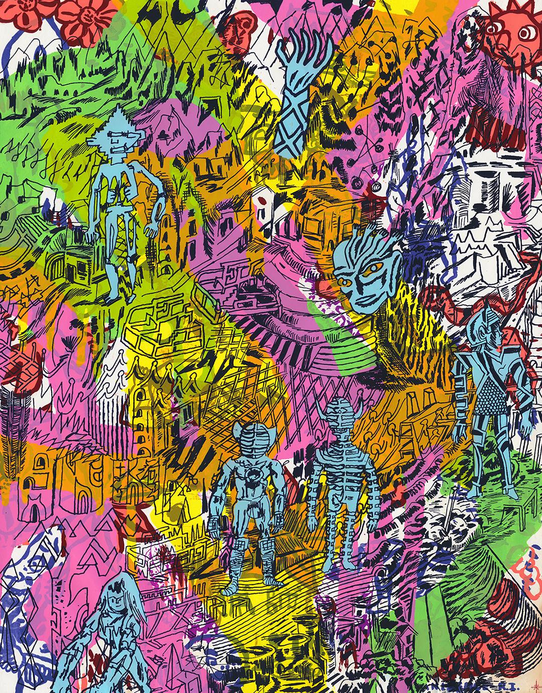 many-colored mash-up silkscreen mini-edition of just 2 copies. 1 available. 19.75"W x 24.75" H. offshoot of the The Warlocks at Dusk print. Designed and printed by Brian Chippendale, 2018