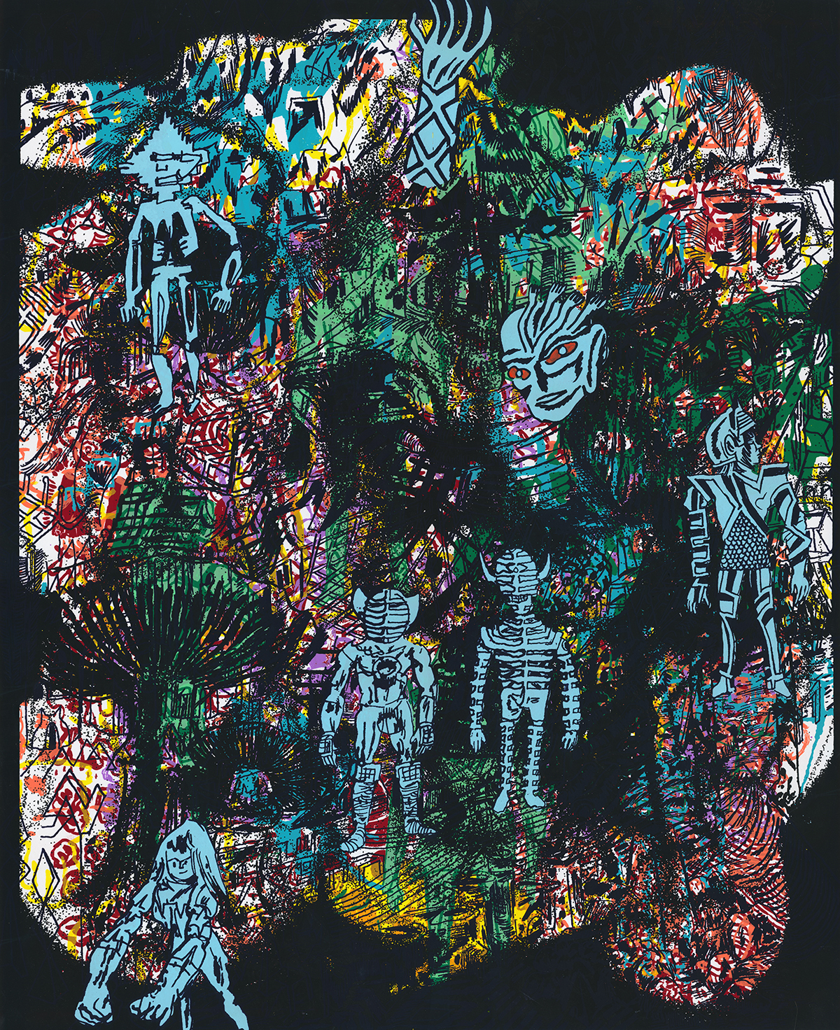 many-colored mash-up silkscreen unique mono print with one touch of paint to make the eyes cooler. 19.75"W x 24.5" H. offshoot of the The Warlocks at Dusk print. Mashups can be started years earlier than they are finished as layers are printed randomly from various prints runs. Brian Chippendale, 2018