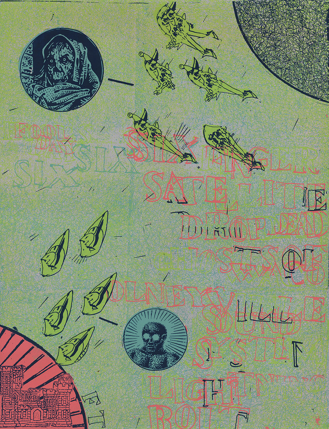 A classic weirdo Providence Fort Thunder poster with a splattering of killer local bands from the era. Six Finger Satellite, Drop Dead, Lightning Bolt, Olneyville Sound System and Ghosts of Waco. you can't go wrong. Circa 1999/ 2000? Old. Rare. 4 color silkscreen. Edition unknown. Maybe 40 or 50. 23"H x 17.5"W. its got Fiend Folio guys. it's hard to read. it gives limited info. Murky coloring. Hits all the stops of the day. A power object. Designed and printed by Brian Chippendale in Fort Thunder.