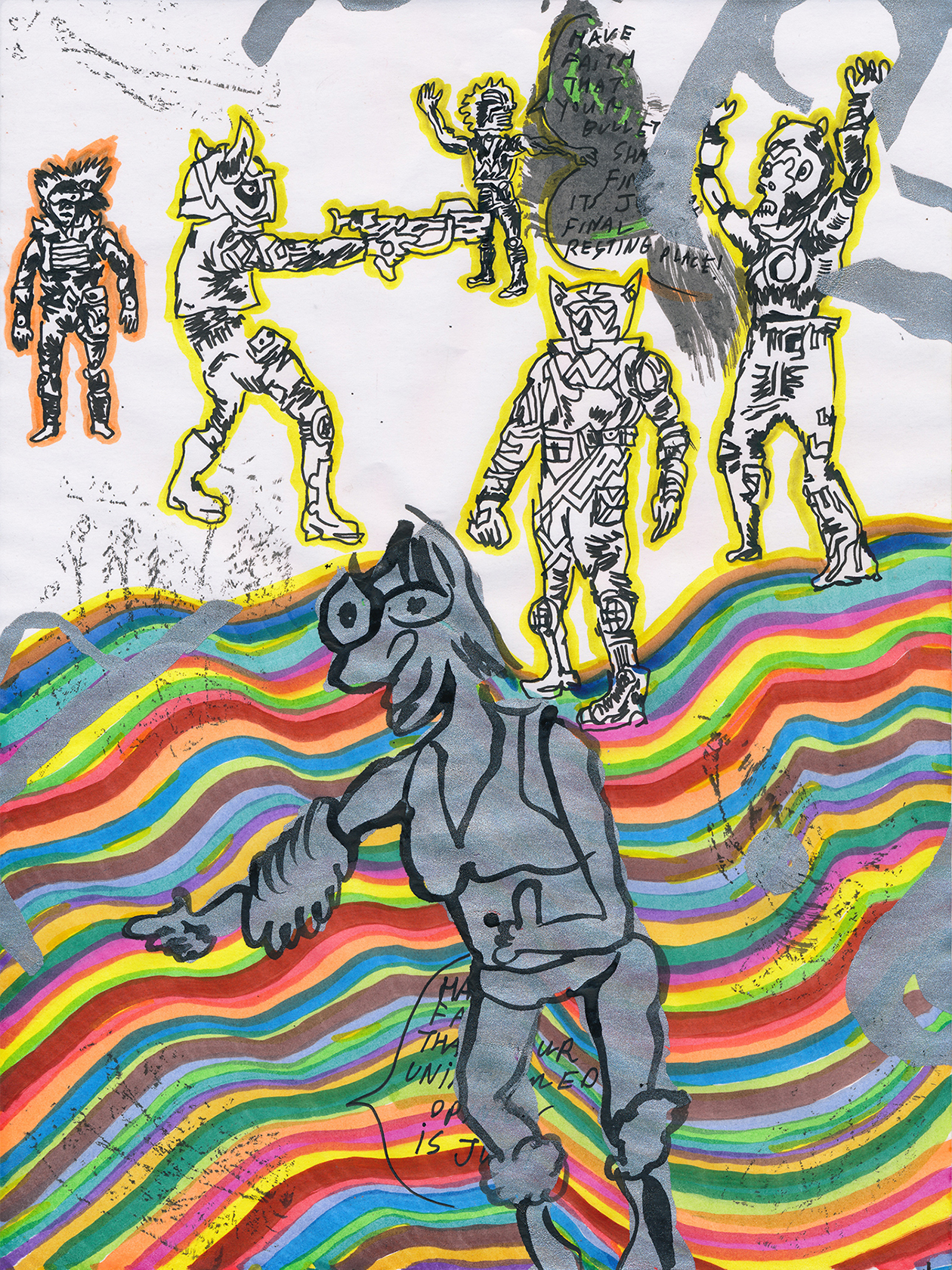 drawing on paper with india ink, silkscreen and marker. 11"H x 8.25" W. Drawn by Brian Chippendale, March 2019