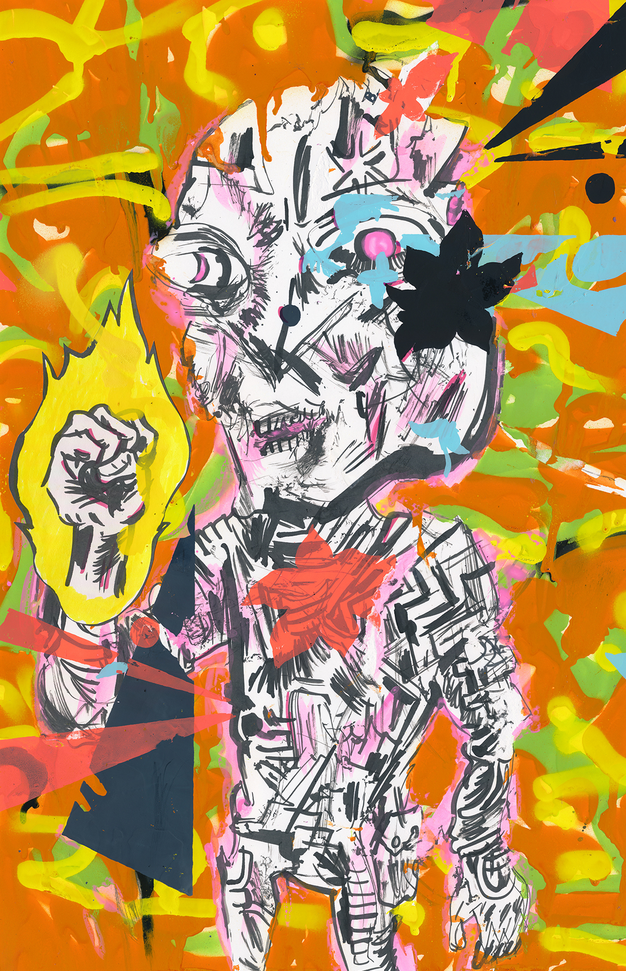 Vorpal drawing on paper with ink, marker and spraypaint, also utilizes some collage and silkscreen. 26"H x 17"W. Brian Chippendale, 2019