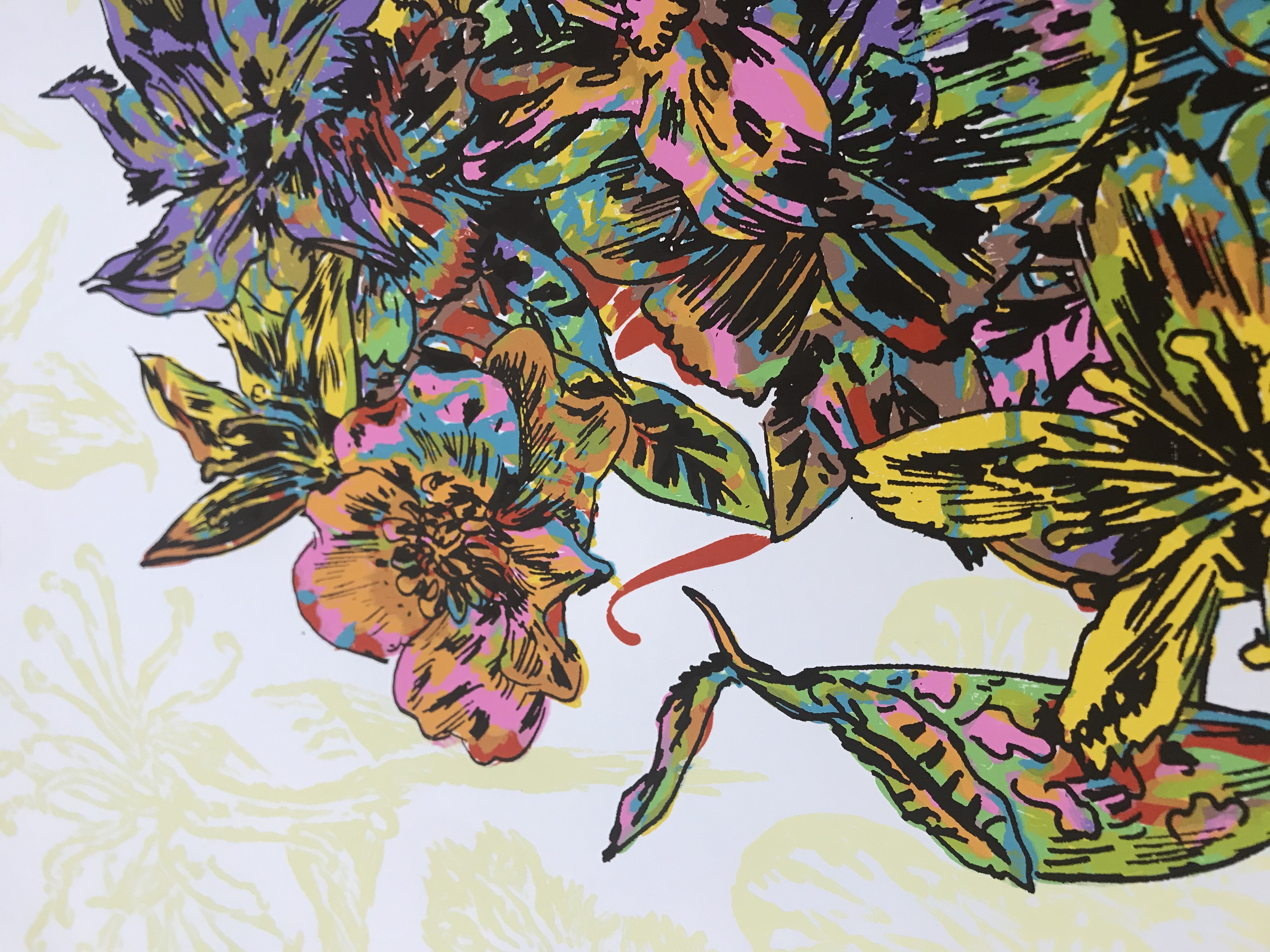 9 color silkscreen. 44 copy 6th edition. All prints are printed by me and signed by me. There are previously 190 numbered copies over 5 small editions of this print which debuted in 2020. 40"H x 24"W. One of my largest prints, just under double the size of its little cousins, the Plant Sapien and Flower Sapien prints. An elaboration on one of Nick Cave's Sound Suits. This new edition now puts the number of these prints on the planet at around 230. That's my version of mass production. Designed and handprinted by Brian Chippendale, 2025.