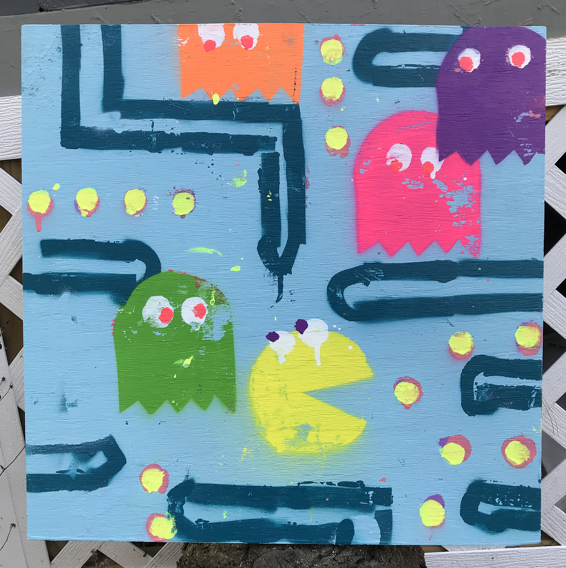 pac man painting. 20" x 20" spray paint on wood panel. Brian Chippendale, 2020