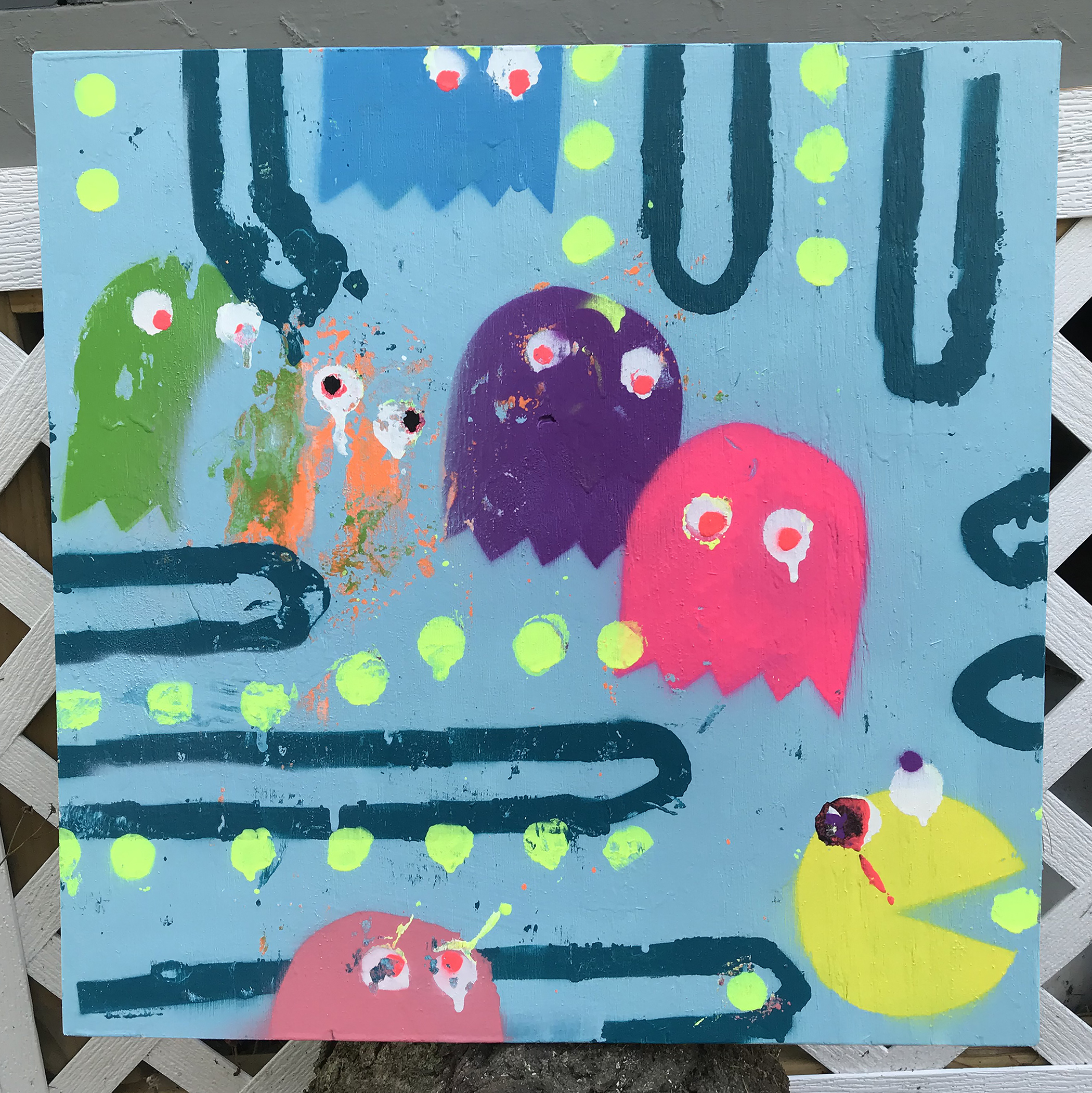 pac-man painting. 20" x 20" spray paint on wood panel. Brian Chippendale, 2020