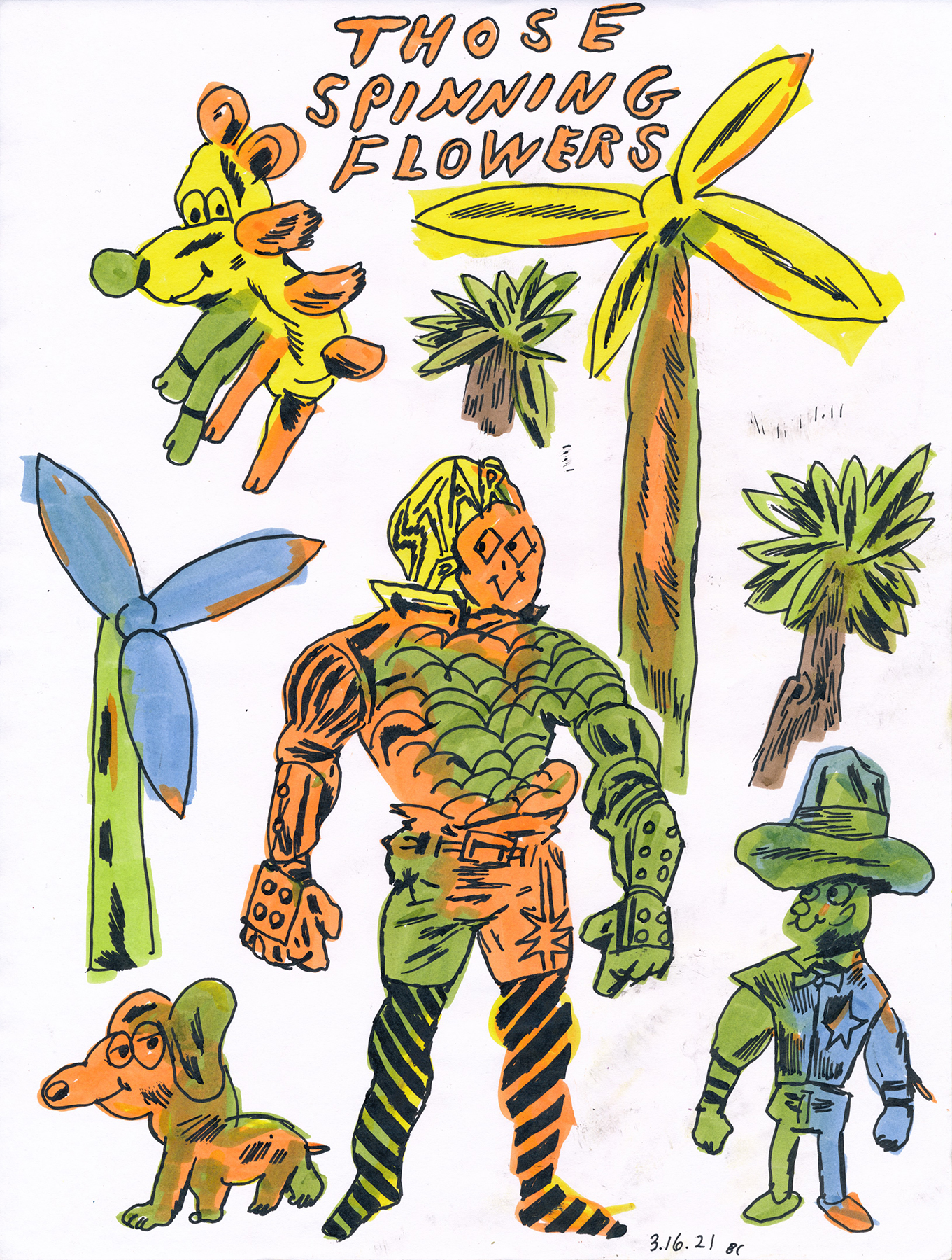 India ink and marker drawing on paper. 8.25H x 10.75"W. Windmills, like flowers? Drawn by Brian Chippendale 2021