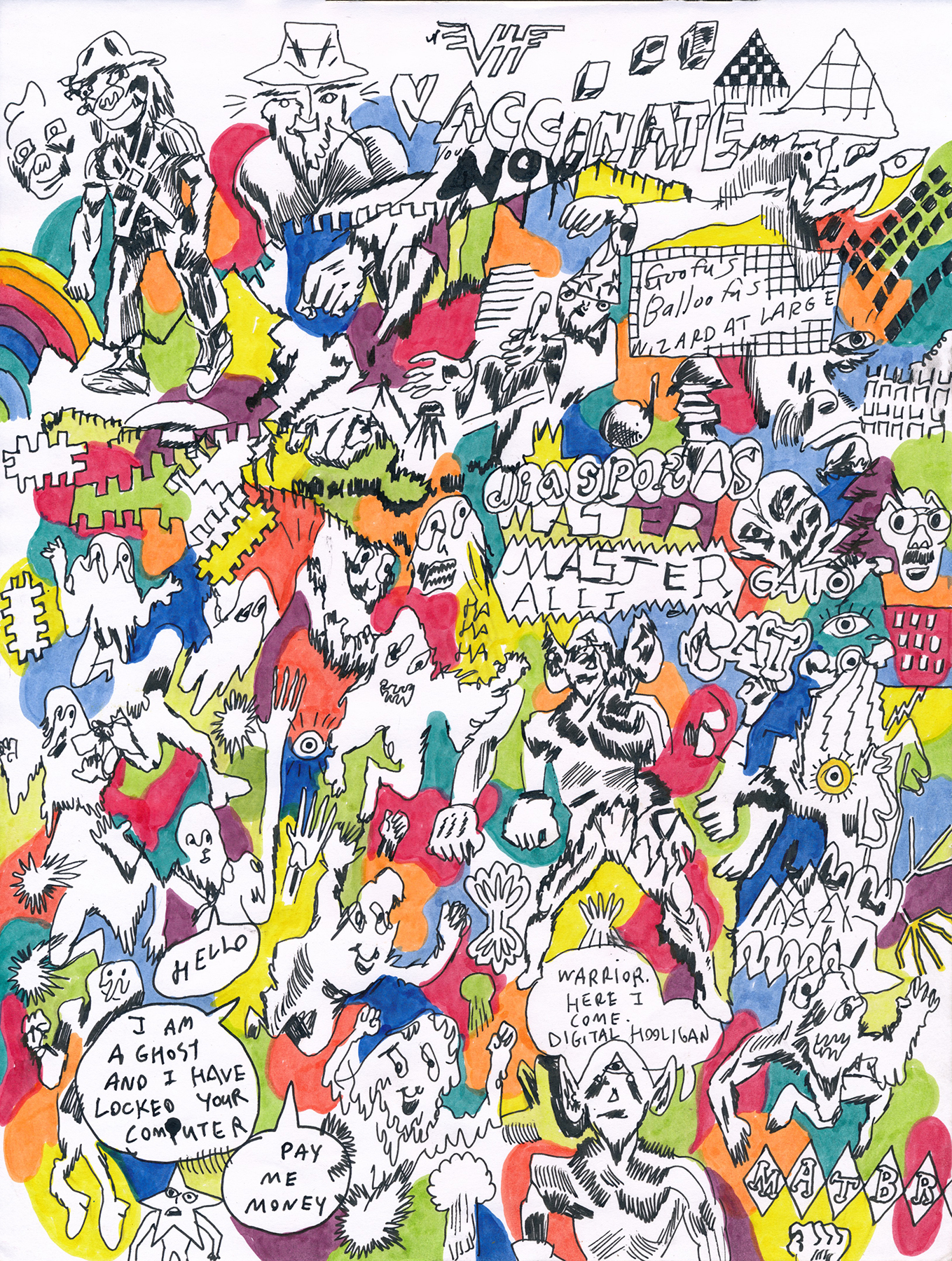 India ink and marker drawing on paper. 8.25H x 10.75"W. Wizards, like flowers? Drawn by Brian Chippendale 2021