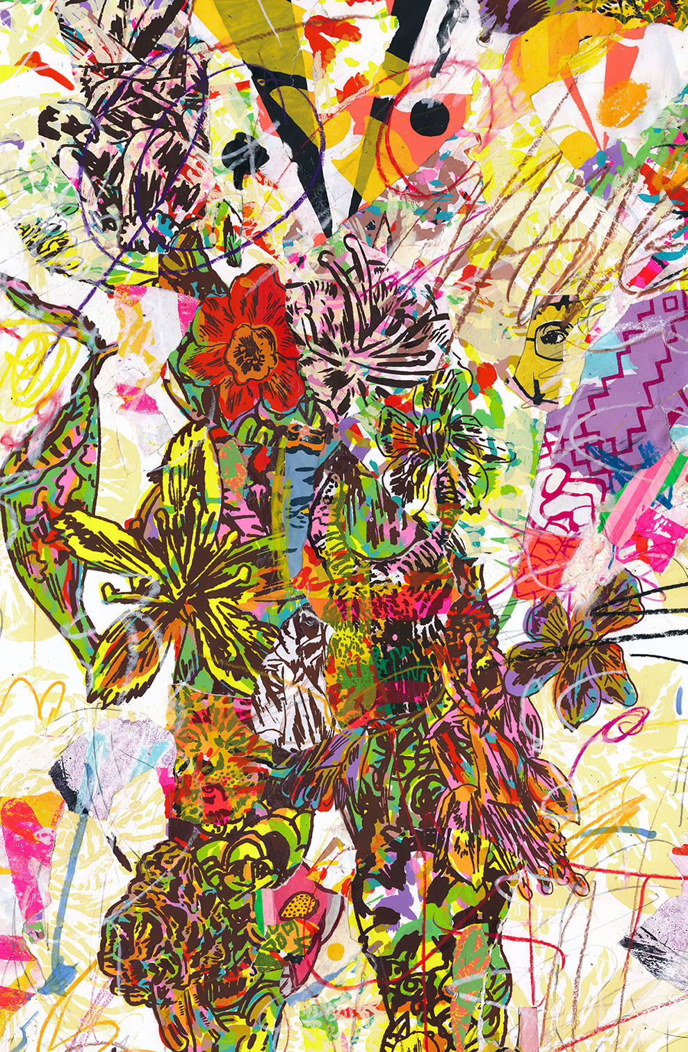 A unique collage on paper with silkscreen, marker, spray paint, crayon, tape and pencil. 35"H x 23"W. Super mutated version of the Megaflora Colossus print. Extra wildness. Undesigned and built by Brian Chippendale, 2021. PS: because of the size of this work international shipping is expensive. You'll be charged $35 at checkout ($25 for Canada) but it's actually a bit more than that, i just feel bad making you pay it all cause its cccccccrazy