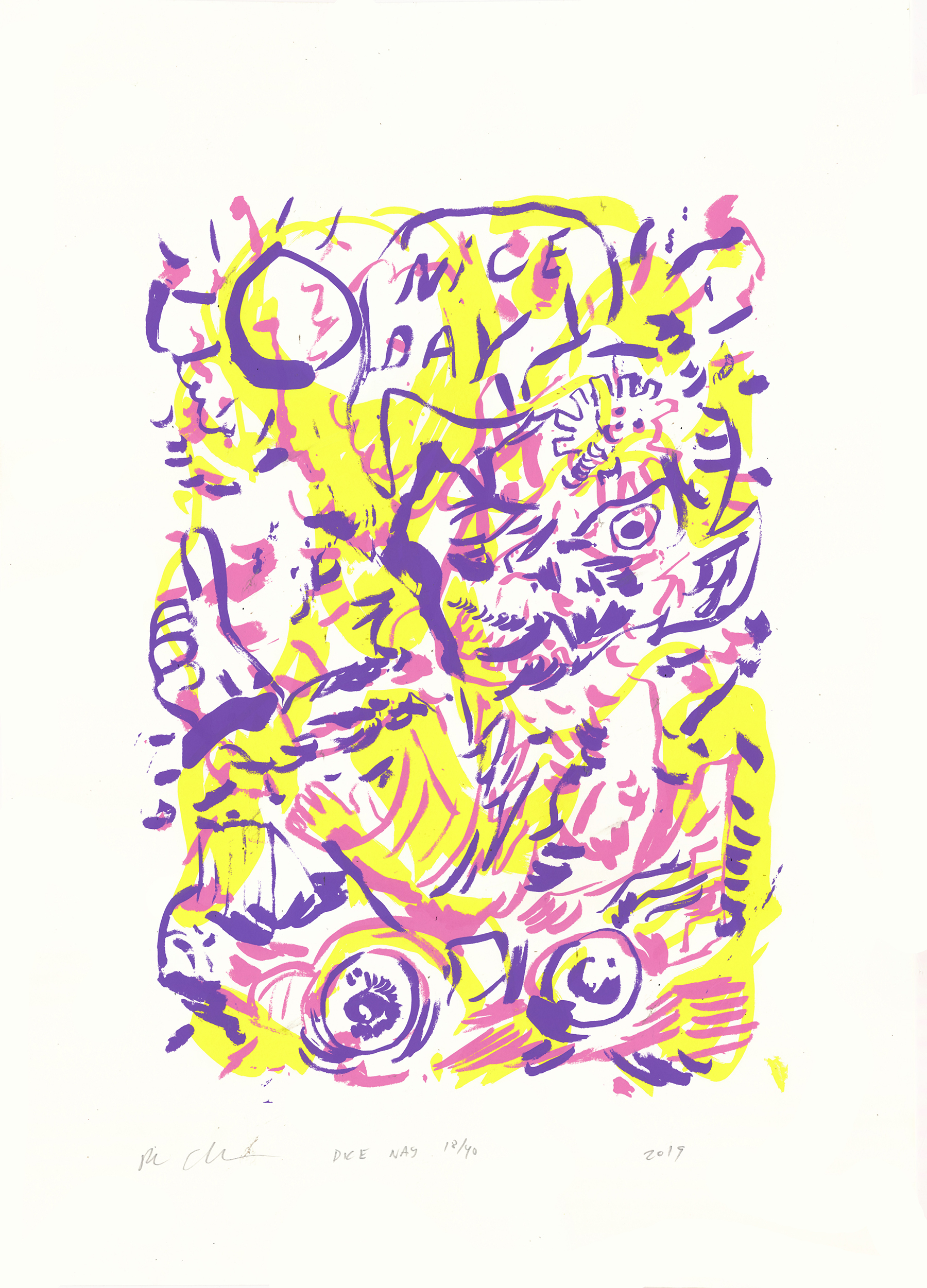 3 color silkscreen. 23.5"H x 16.5"W. edition of 40. Printed in Utrecht during the 2019 Le Guess Who festival when Lightning Bolt played. designed and printed by Brian Chippendale