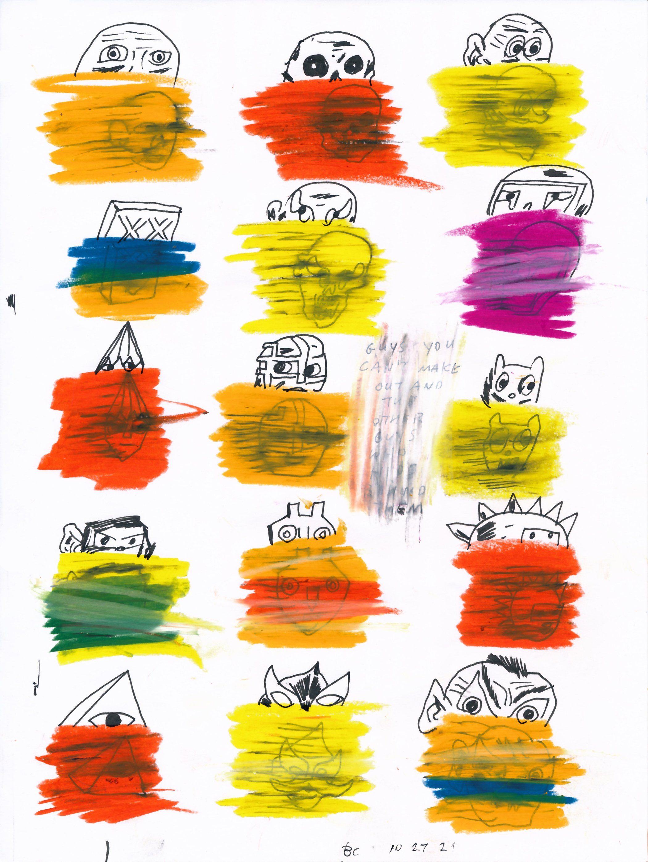 ... AND THE OTHER GUYS WHO HIDE BEHIND THEM". Drawing with india ink and crayon on paper. 8.25H x 10.75"W. Guys. but not necessarily guys. Brian Chippendale, October 2021