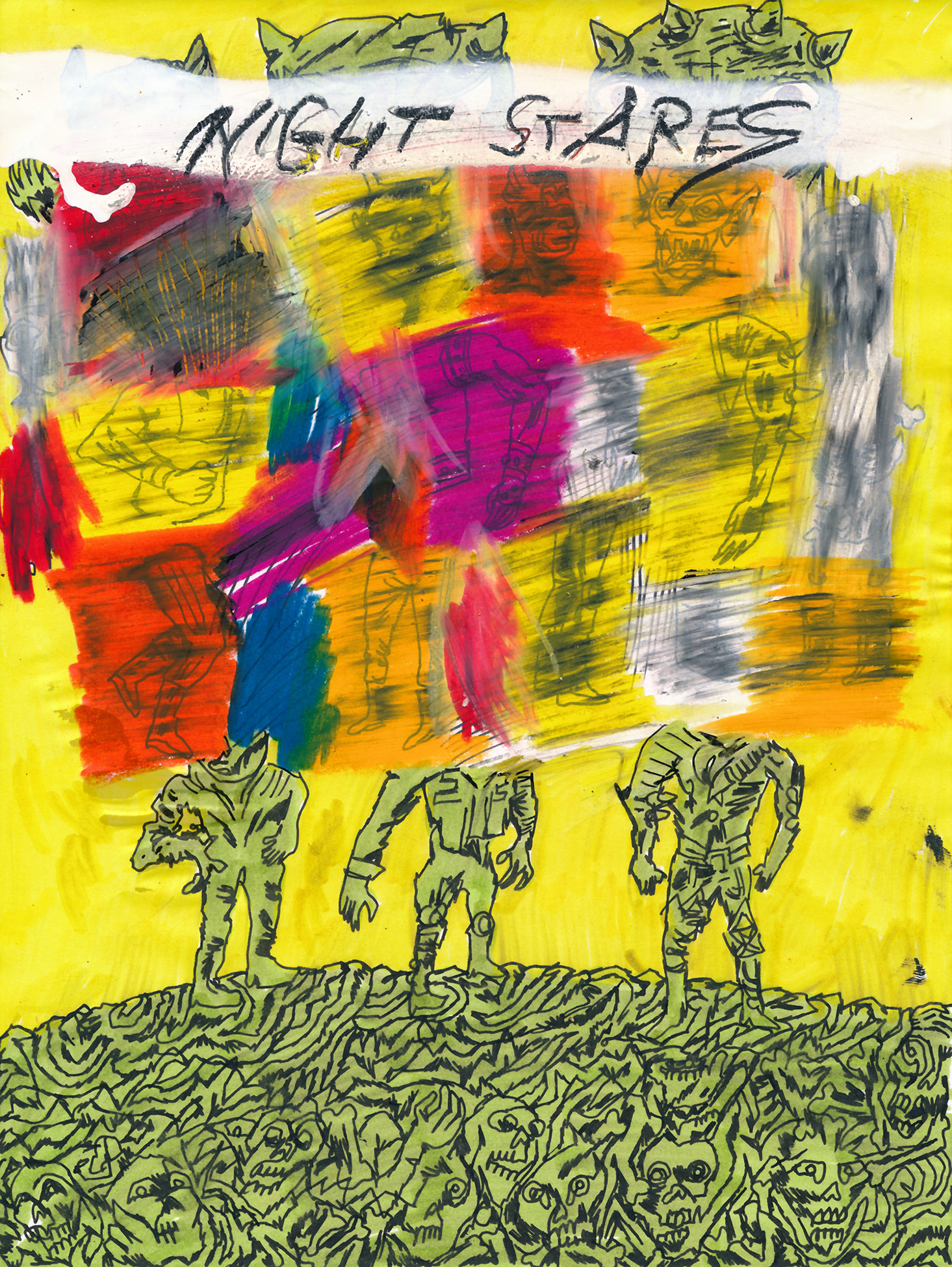 Drawing with india ink, spray paint, pencil, marker and crayon on paper. 8.25H x 10.75"W. Night Stares. Brian Chippendale, October 2021