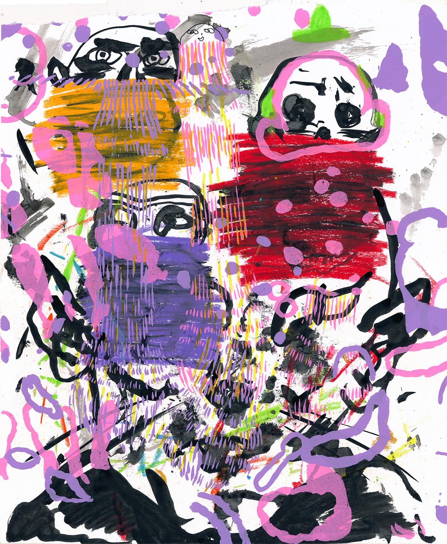 Drawing on bristol board with India Ink, pastel, silkscreen and marker. 14"W x 17"H with a ragged edge on the top left half, i found the paper like that before i made it. It's visible in the photo. Personality, so hard to find these days. Brian Chippendale, fall 2021