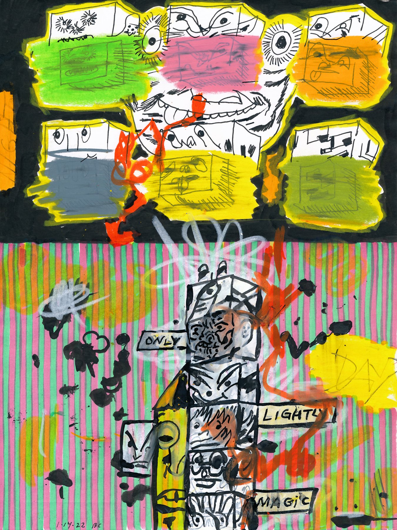 Drawing with india ink, pencil, pastel and marker on paper. 8.25H x 10.75"W. This is the second drawing in a sort of "whisper down the lane" series where i redraw a drawing but with subtle changes from the one before it in line. Brian Chippendale, January 2022