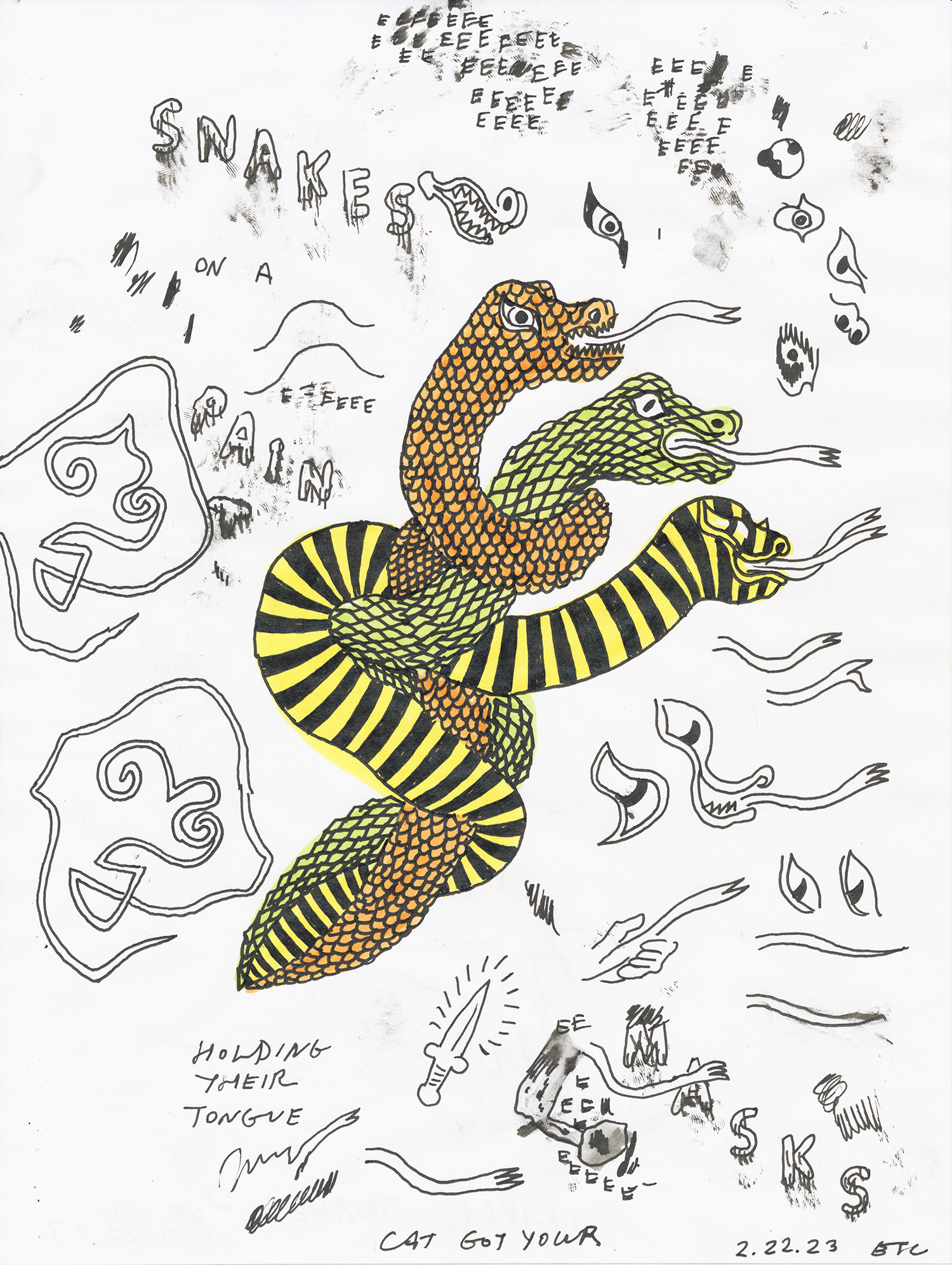 India ink drawing with marker on paper. 8.25H x 11"W. Second in the Triple Snakes series. Drawn by Brian Chippendale 2023