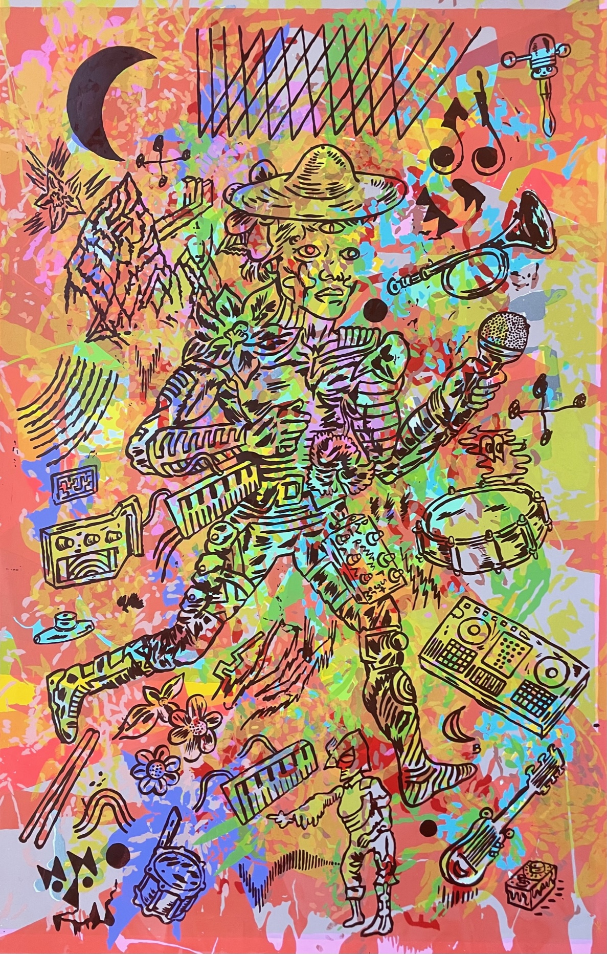 many colored many screened unique mash up silkscreen monoprint. built up over a couple years. 34"H x 22"W. Undesigned and handprinted by Brian Chippendale
