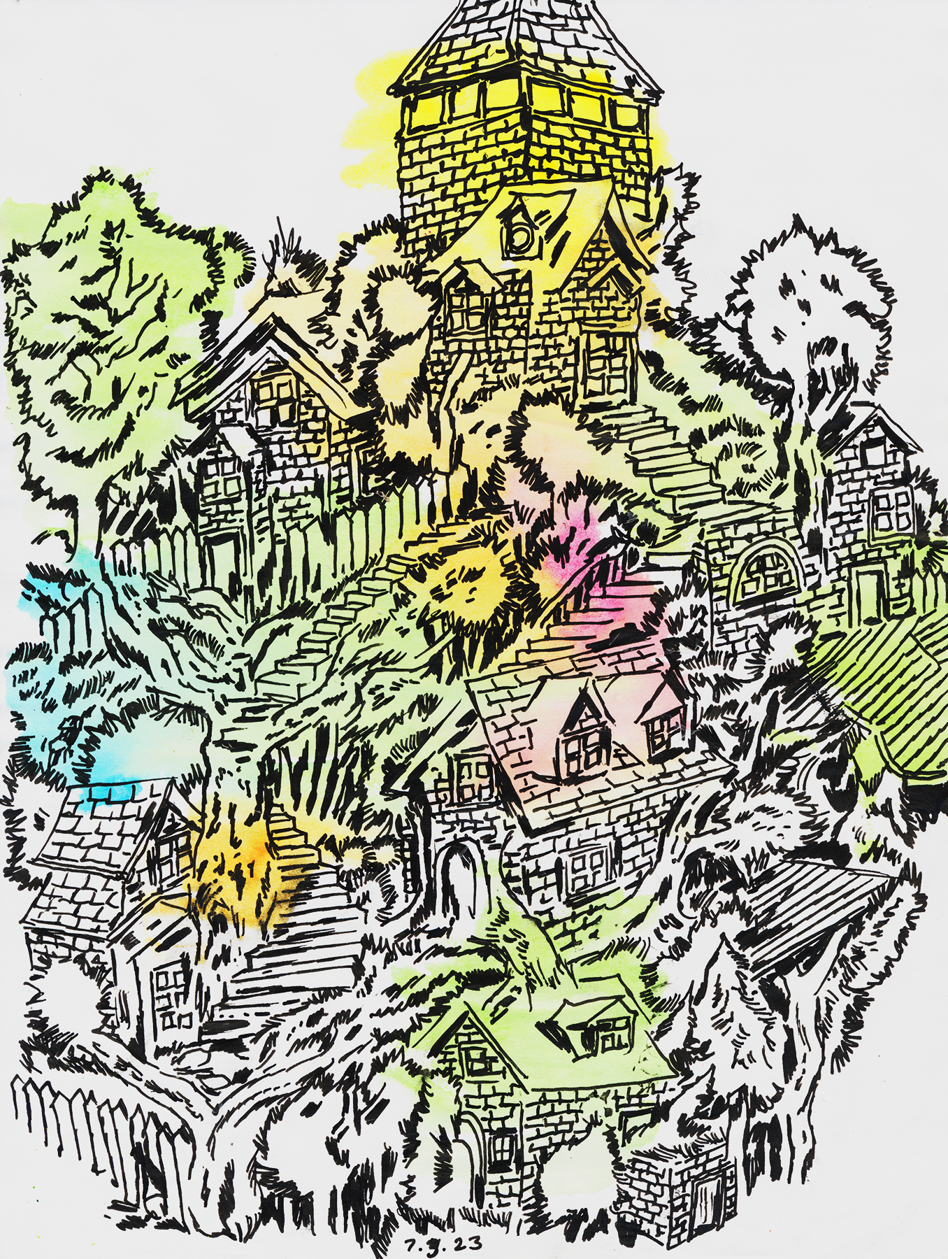 India ink drawing with watercolor on paper. 8.25H x 11"W. Drawn from Cape Cod houses. by Brian Chippendale. 2023.