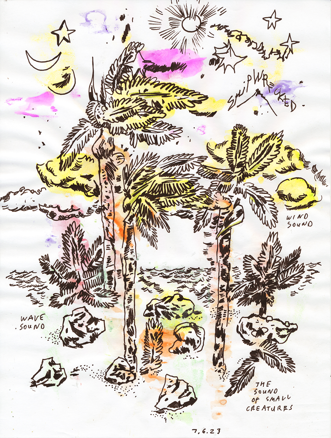 India ink drawing with watercolor and marker on paper. 8.25H x 11"W. Drawn by Brian Chippendale after a trip to Barbados. 2023.