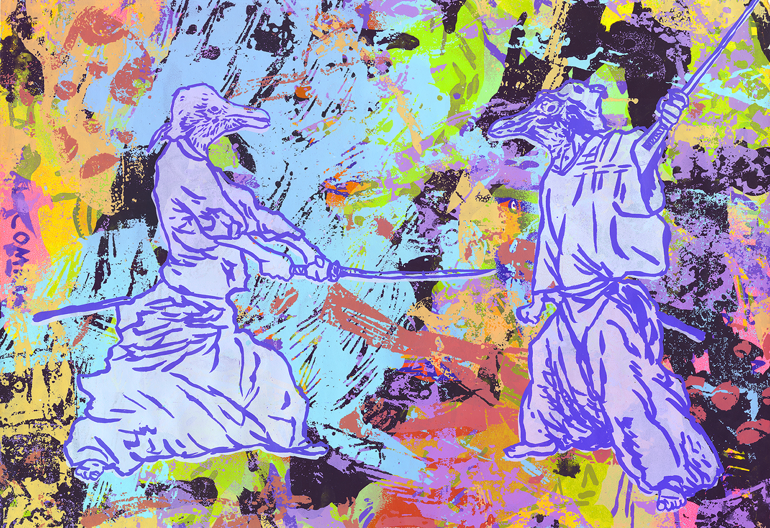 a unique many many color mashup silkscreen print featuring the animal samurai from the Lightning Bolt Yellow CD Release print. 14"H x 20.5"W. Undesigned and printed by Brian Chippendale probably 2015-2023