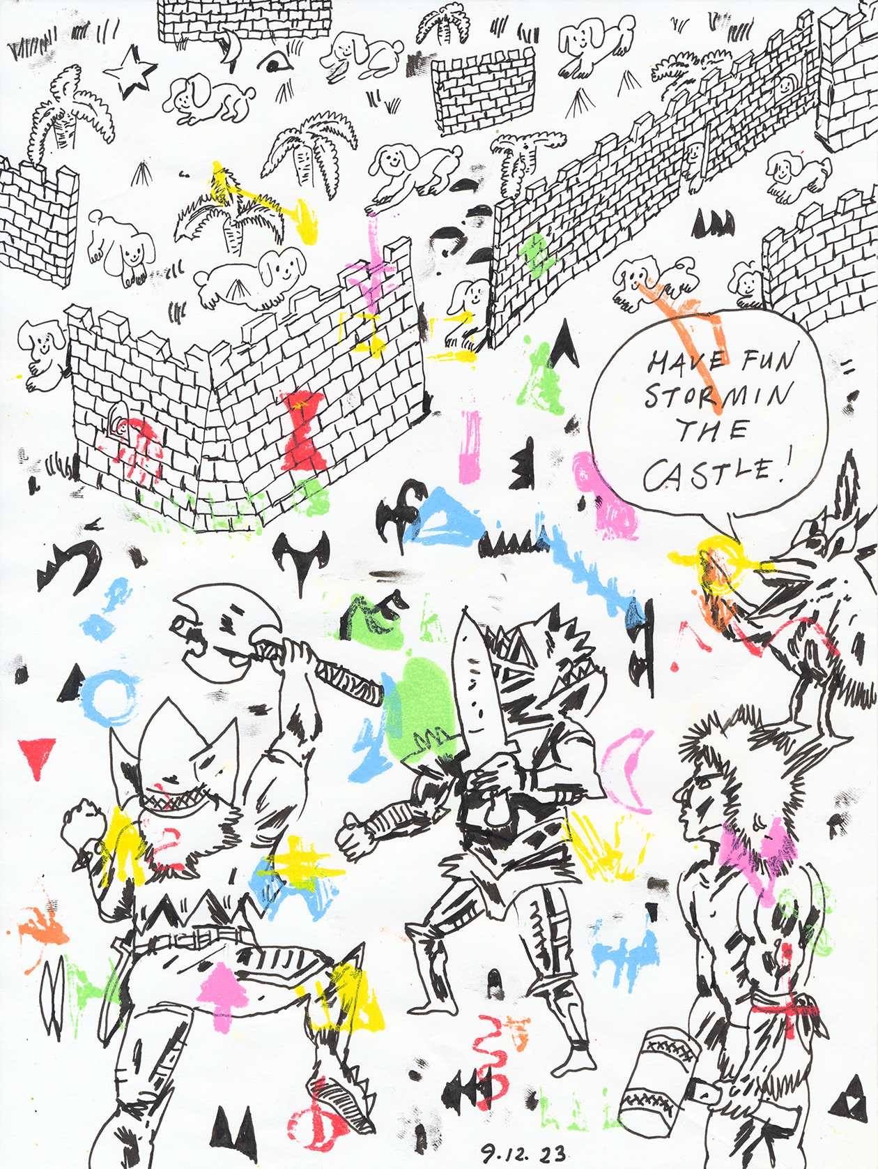 India ink drawing with paint pen on paper. 8.25"H x 11"W. you can never have too much fun whilst storming the castle. Drawn by Brian Chippendale. 2023.