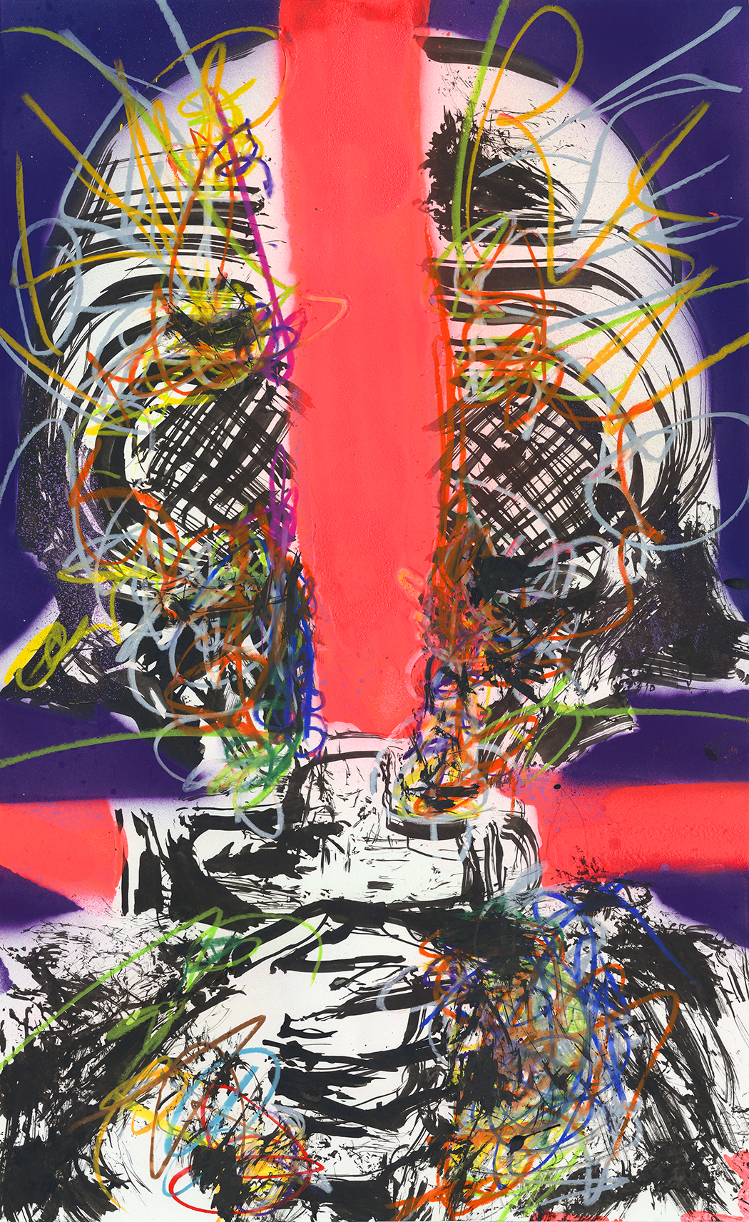 Drawing on paper with india ink, crayon and spray paint. 26"H x 16"W. Portrait of the tragic Star Wars villain-hero Kylo Ren. Drawn by Brian Chippendale, November 2023