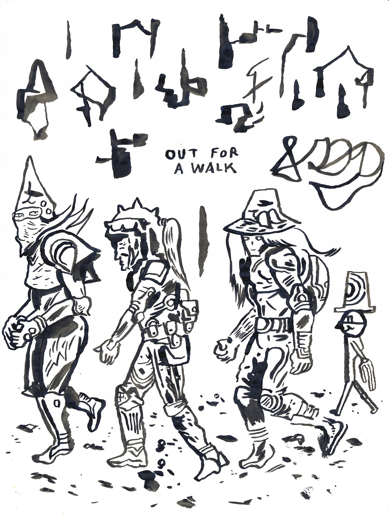 unique drawing. india ink on paper. 8.25"W x 11"H. some folks out for a walk. Brian Chippendale 2024