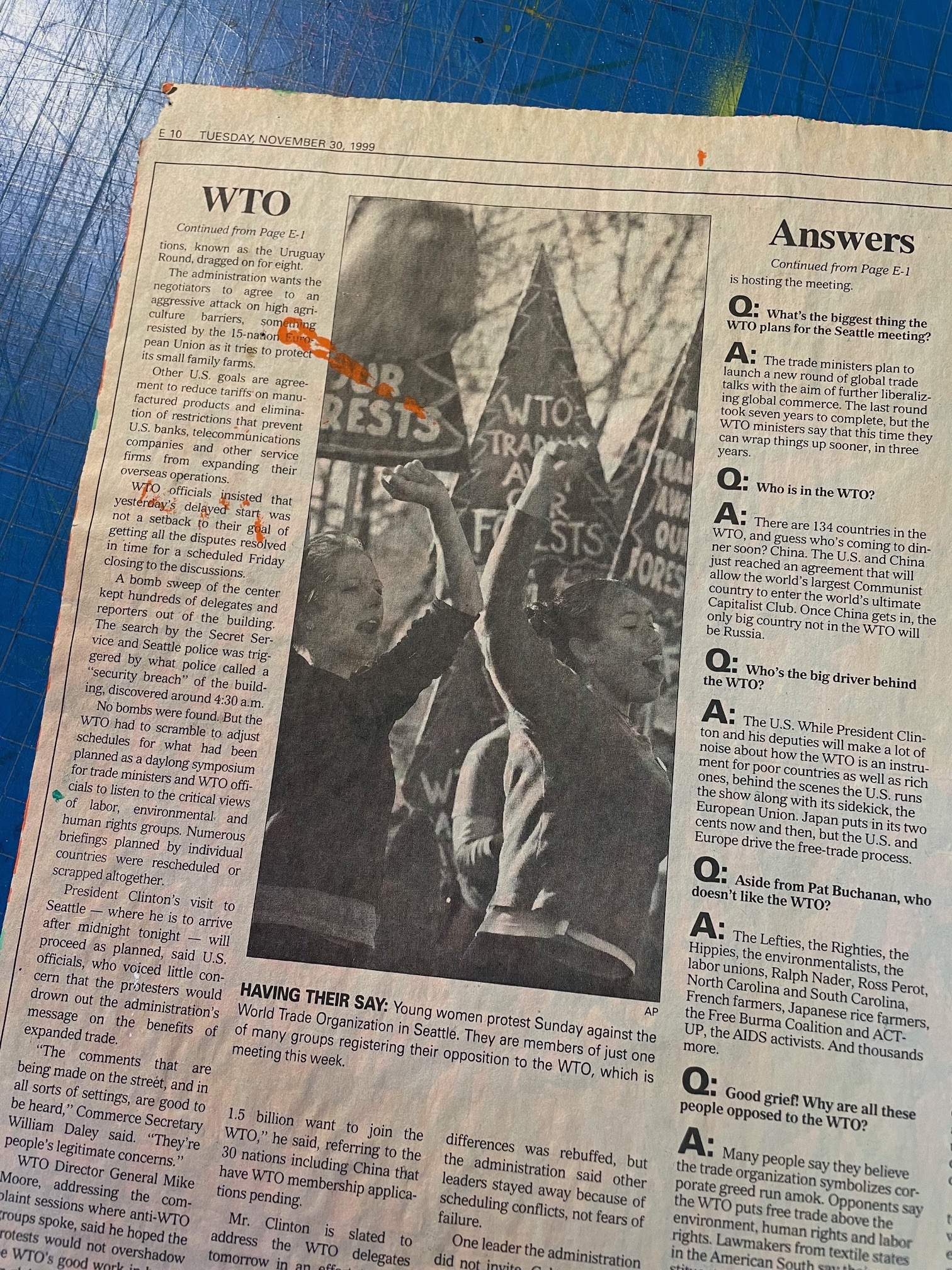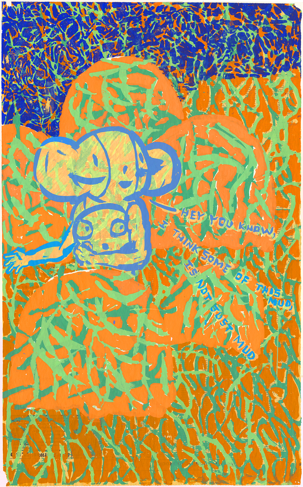 9 color silkscreen. 24"H x 13.25"W. There is one copy of print #9 in a series of 16 prints printed in the late 90s on pages of the Providence Journal newspaper. The series is about a gang of characters walking through thick orange mud deep under the Earth's surface. It has an early sighting of the characters "If and Oof" (who later had their own graphic novel.) Copies of this series are very rare, maybe 20 copies of each exist(or existed). It is on newspaper which makes it somewhat fragile but it is in good shape. Designed and handprinted by Brian Chippendale in Fort Thunder, Providence Rhode Island.