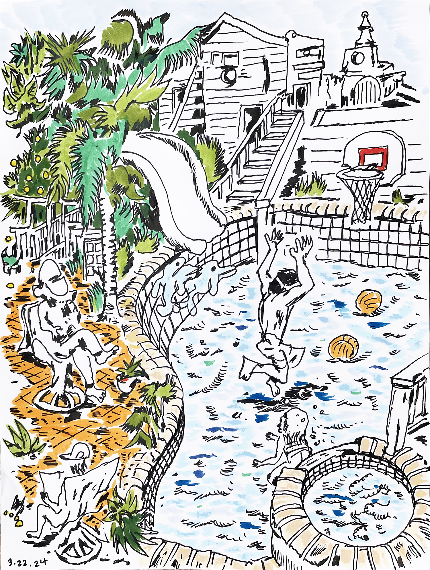 India ink drawing with marker on paper. 8.25"H x 11"W. Drawn by Brian Chippendale in LA. 2024