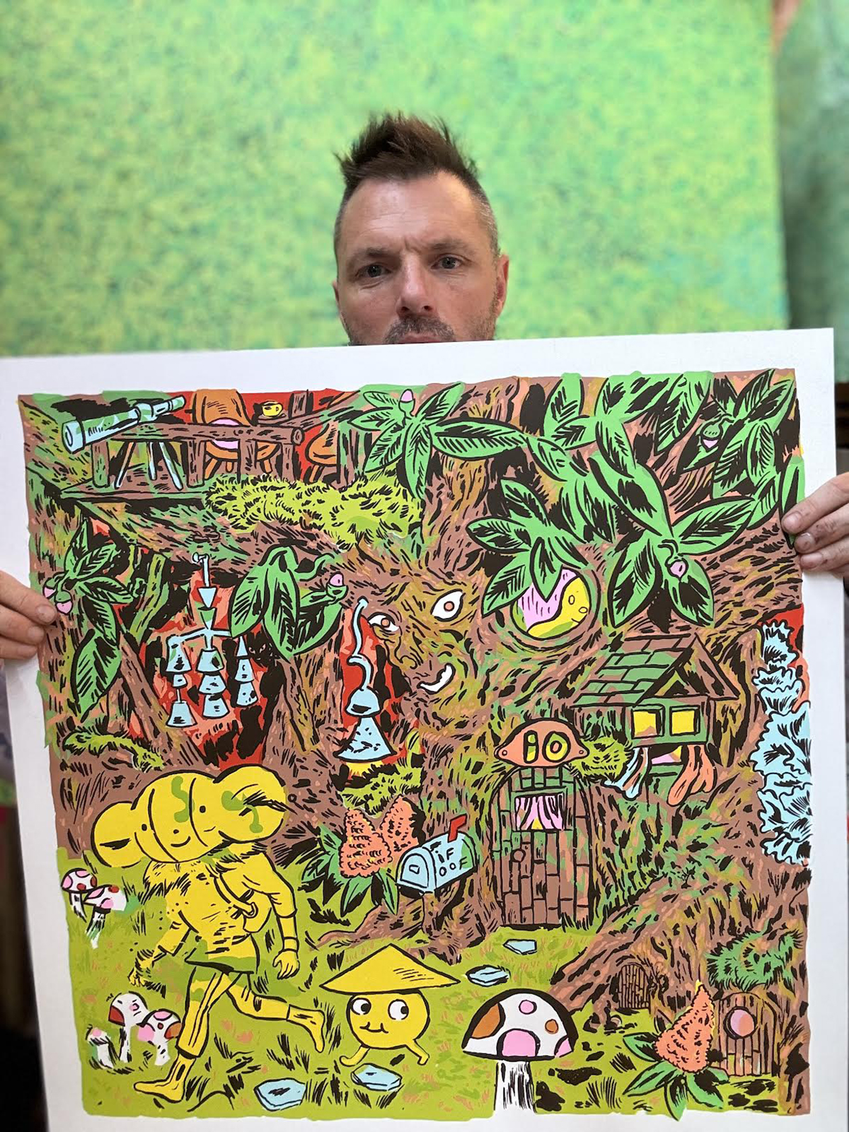 8 color silkscreen on 100lb cover. 24.5"H x 24.5"W. Edition of 50. my characters If 'n Oof set out from their forest home for a walk. Designed and handprinted by Brian Chippendale. 2024