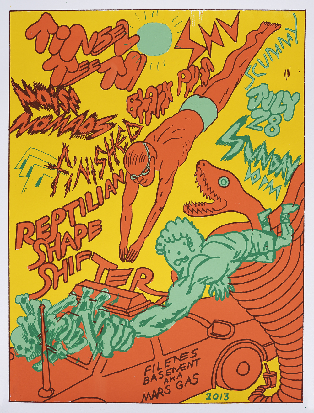 5 color silkscreen. 21"H x 16"W. Numbered edition of 30. This is a show poster, bands include Black Pus, Tinsel Teeth, Reptilian Shape Shifters, Noise Nomads, SHV and Finished. Printed in July 2013. Designed and handprinted by Brian Chippendale.