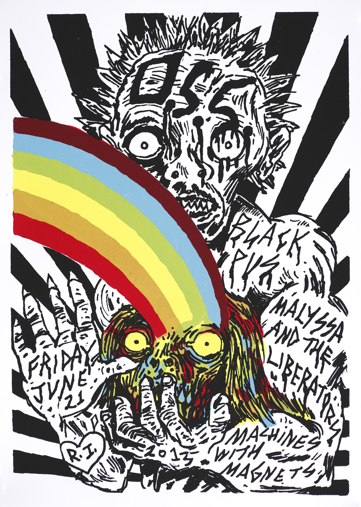 4 color silkscreen. 24"H x 17"W. Numbered edition of 50. This is a show poster, bands include Black Pus, Olneyville Sound System and Malyssa and the Liberators. Printed in June 2013. Designed and handprinted by Brian Chippendale