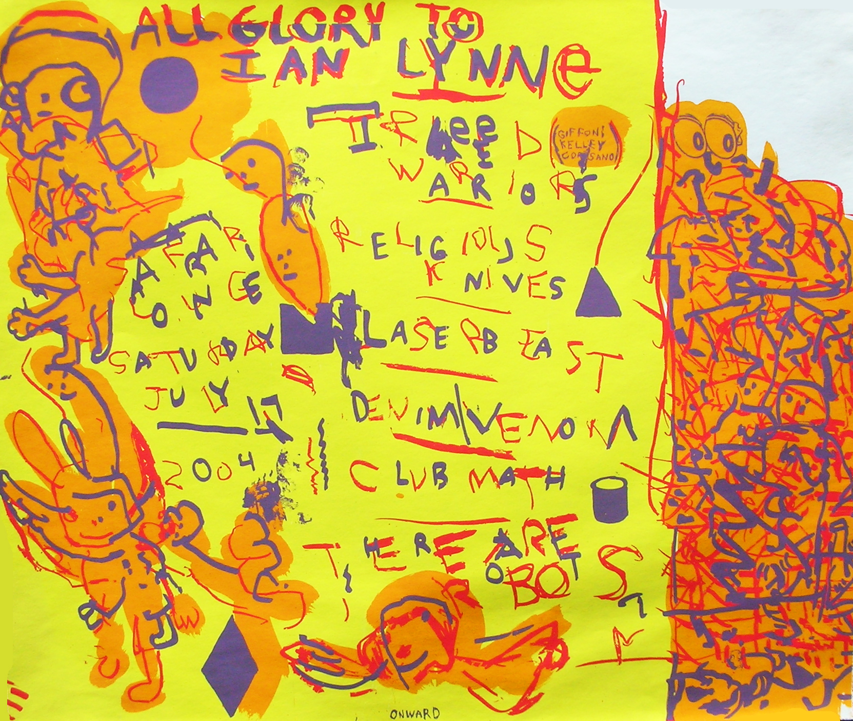 4 color silkscreen. 18"H x 21"W. This is a show poster from Providence's legendary Safari Lounge. Bands include, "Laserbeast"(Lightning Bolt playing under a fake name), Treed Warriors(Giffoni, Corsano, Kelley trio), Religious Knives, Denim Venom, Club Math and There are Robots. Last two copies. Signed, not numbered. I didn't number very often back then. Probably a print run of 60-80 copies on this. Printed in July 2004. Designed and handprinted by Brian Chippendale.